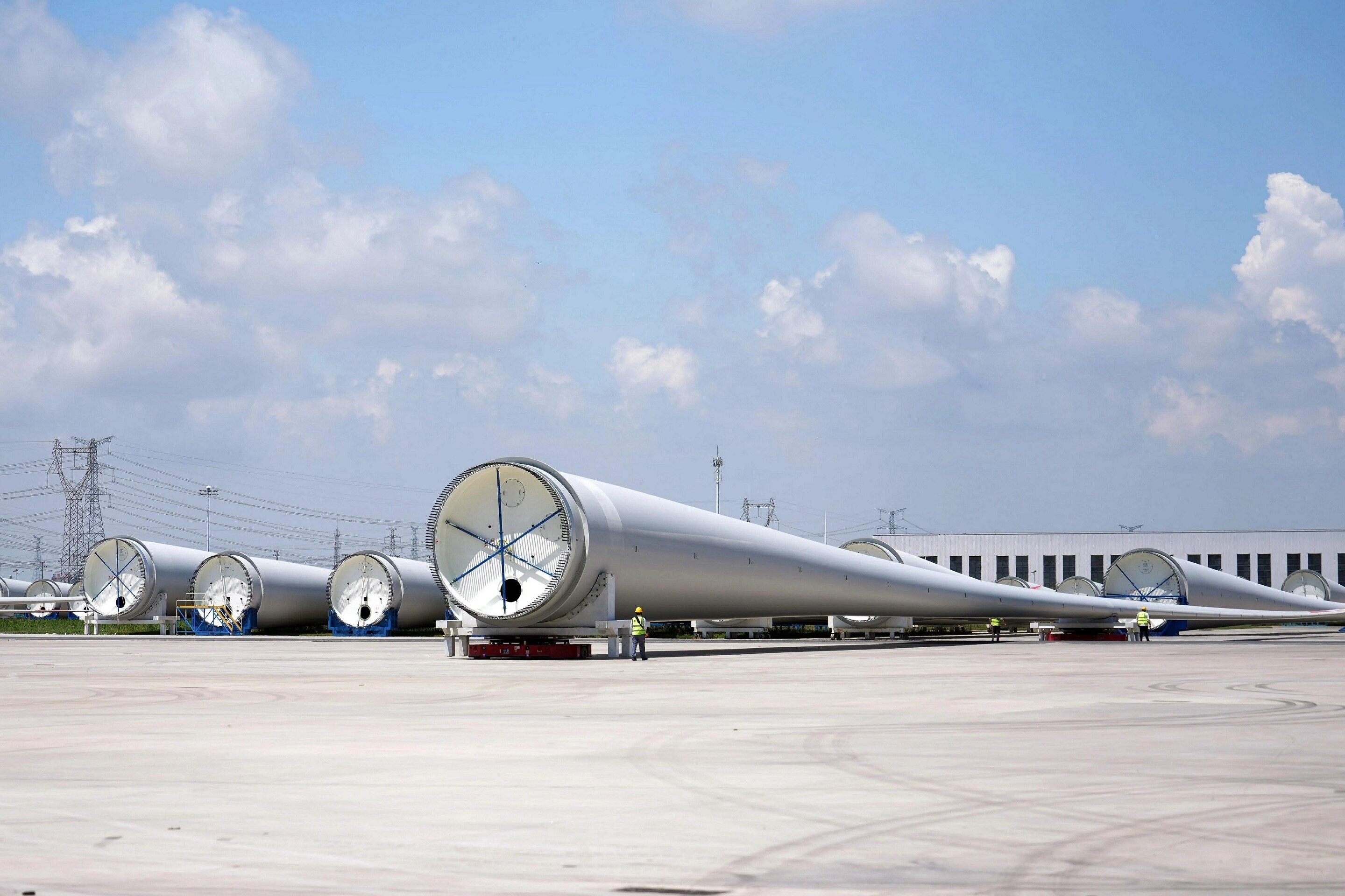 近日,中国中车集团旗下时代新材自主研发的国内首套可回收热固性树脂叶片TMT82在时代新材公司风电叶片射阳工厂发货。