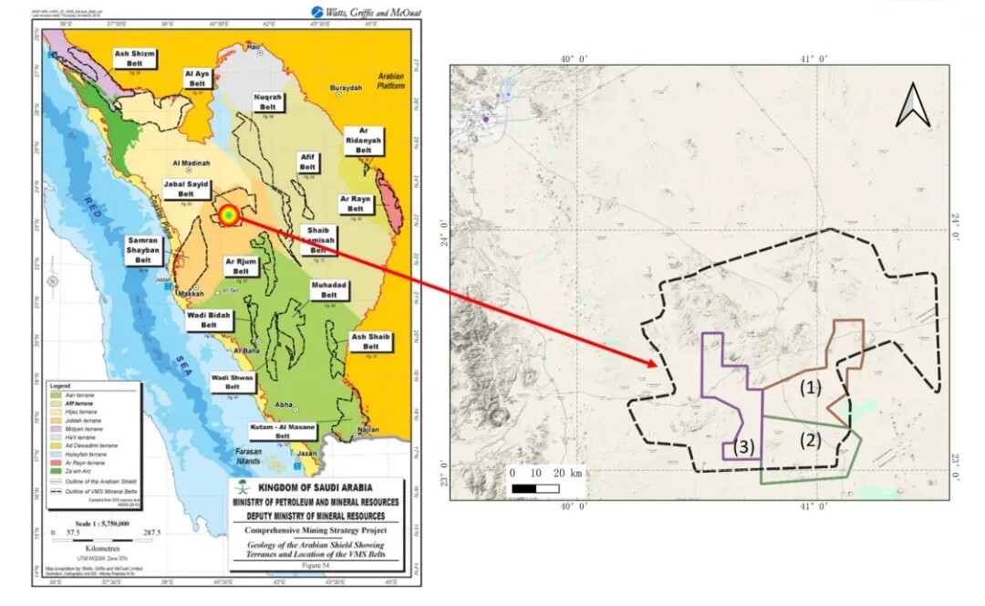 此次中标的Jabal Sayid–2区块位于Jabal Sayid矿化带内,隶属于阿拉伯-努比亚地盾。该地盾形成于距今10亿至5.4亿年前,由多个地体经过造山作用拼贴而成,并孕育了大量金、铜等多金属矿床,其中尤以火山成因块状硫化物矿床(VMS)最具代表性。