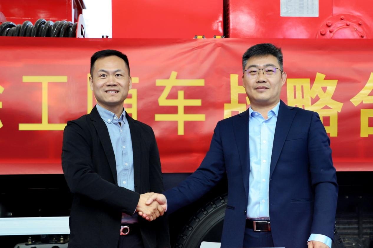 一场意义非凡的战略合作签约仪式在展会现场盛大举行,徐工随车与国内最大的油田服务公司达成深度合作,郑重签署战略合作协议。此次强强联合,将全方位整合双方在技术、人才、市场等多方面的优势资源,致力于攻克绿色修井技术难题,加速推动相关技术成果转化与产业升级,为整个行业的绿色可持续发展注入强劲动力。