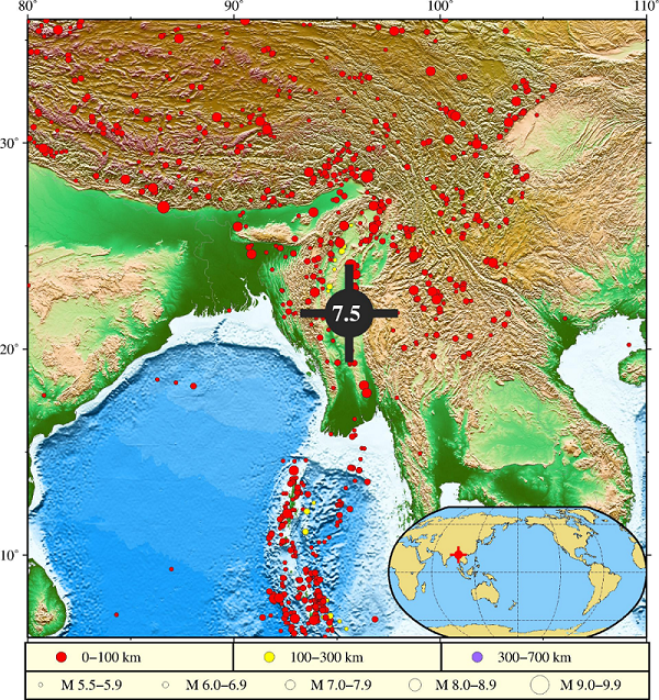 中国地震局专家团队分析指出,此次地震位于印缅板块边界实皆断裂带,是1900年以来该区域第4次7.5级以上地震。