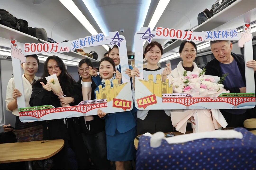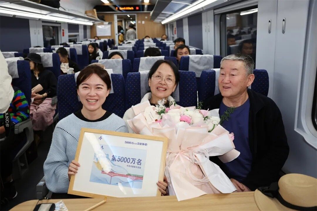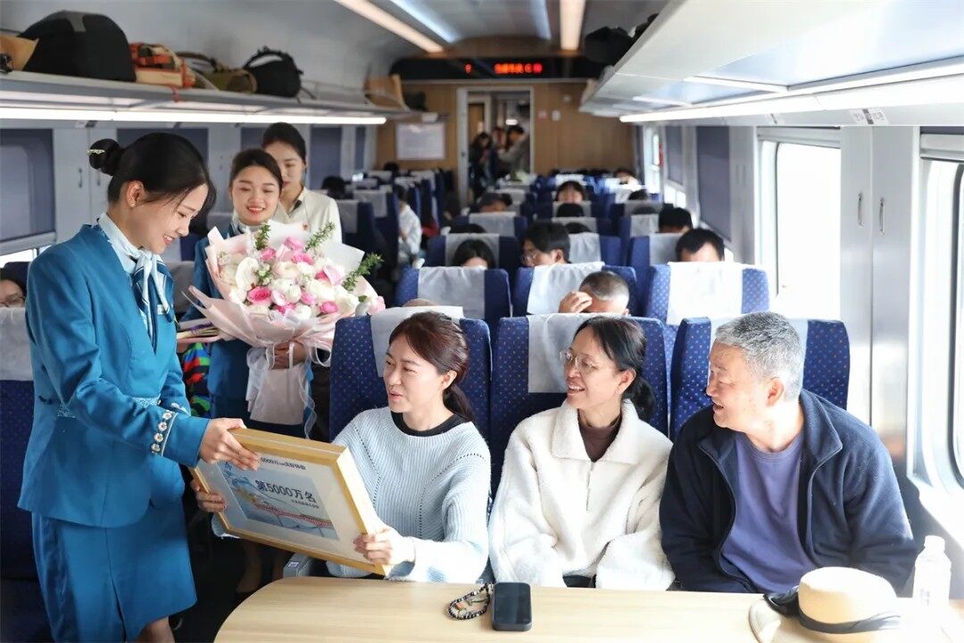 3月28日9时18分,幸福降临到一名乘坐C268次列车从昆明站发出驶向西双版纳到达昆明站的7号车厢的旅客身上——列车工作人员将一张印有“中老铁路第5000万名旅客”字样的纪念证书和一束鲜花送到孙女士手中。“太幸运了,没想到我是中老铁路第5000万名旅客。”孙女士激动地说道。