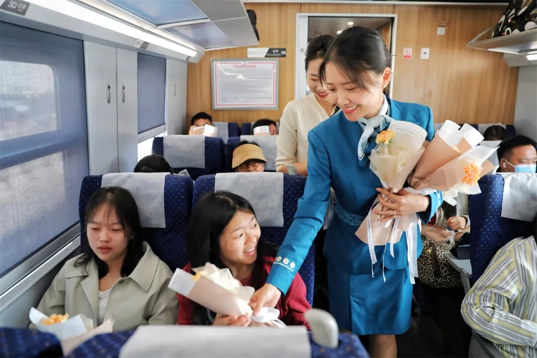 列车工作人员准备了康乃馨送给列车上其他旅客,车厢里花香四溢、气氛热烈,大家一起拍照留念,共同庆祝中老铁路发送旅客突破5000万人次。