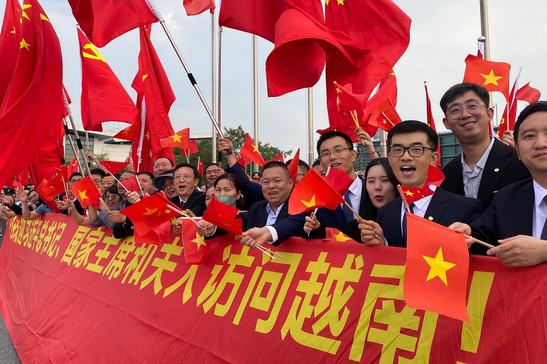 4月14日中午,中共中央总书记、国家主席习近平乘专机抵达河内,受越南共产党中央委员会总书记苏林、越南社会主义共和国主席梁强邀请,对越南进行国事访问。习近平主席下机后,越南党政领导人和地方代表热情迎接。当地青年身着民族服装,擂响鼓乐,载歌载舞,挥动两党两国旗帜,热烈欢迎习近平主席到访。