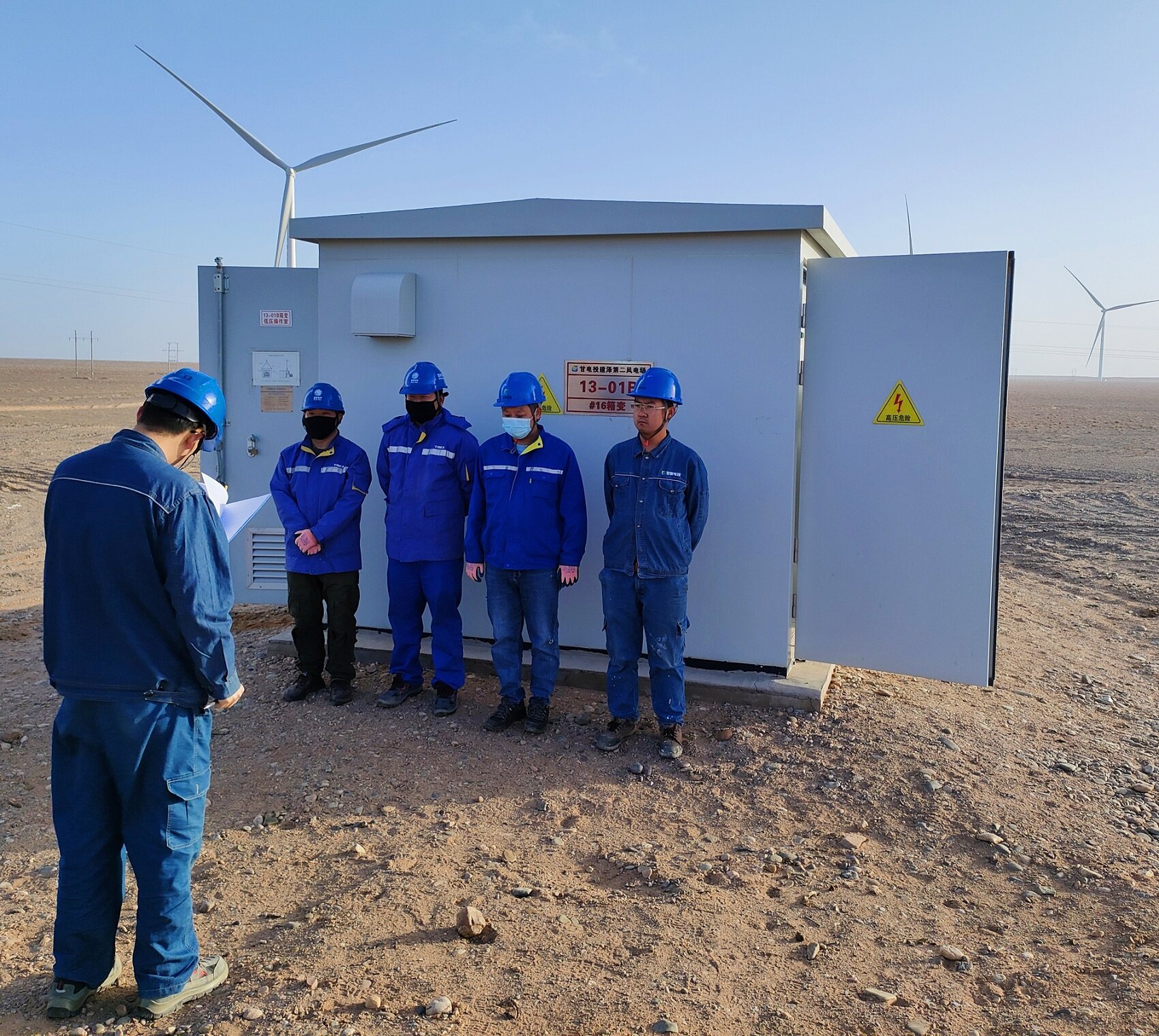 在作业过程中,检修人员严格履行外委作业安全监督旁站职责,避免外委作业人员在拆除连接线路时对周边设施造成损坏或作业面失控,作业过程中,面对风电场地形复杂,大型吊装设备行动迟缓,天气变化无常等诸多不利因素影响,给施工增加了不小的难度,但检修人员们沉着应对、克服重重困难,严格按照“四措两案”高效、有序地推进更换工作,终于经过数小时的奋战,顺利完成2台箱变的更换调试工作。工作结束后,盐池滩检修班立即组织召开了班组总结会议,对这次箱变更换工作进行了全面的复盘,为后期更换工作的顺利开展积累了宝贵的经验。