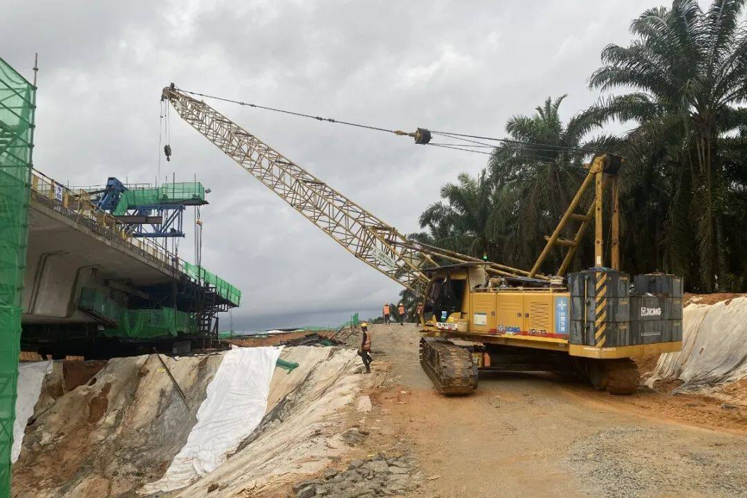 在马来西亚东海岸铁路建设的工地上徐工XGC75履带起重机正以擎天之势吊装关键构件。马来西亚东海岸铁路是标志性项目,全长 600 多公里,将构建连接马来西亚东西海岸的重要 “陆上桥梁”,打通关丹港和巴生港,提升货物运输效率,助力马来西亚融入国际贸易体系。与徐工XGC75履带起重机协同作战的还有徐工ZS120K搅拌站,其精准浇筑能力,助力这条贯通东西海岸的经济大动脉加速成型。