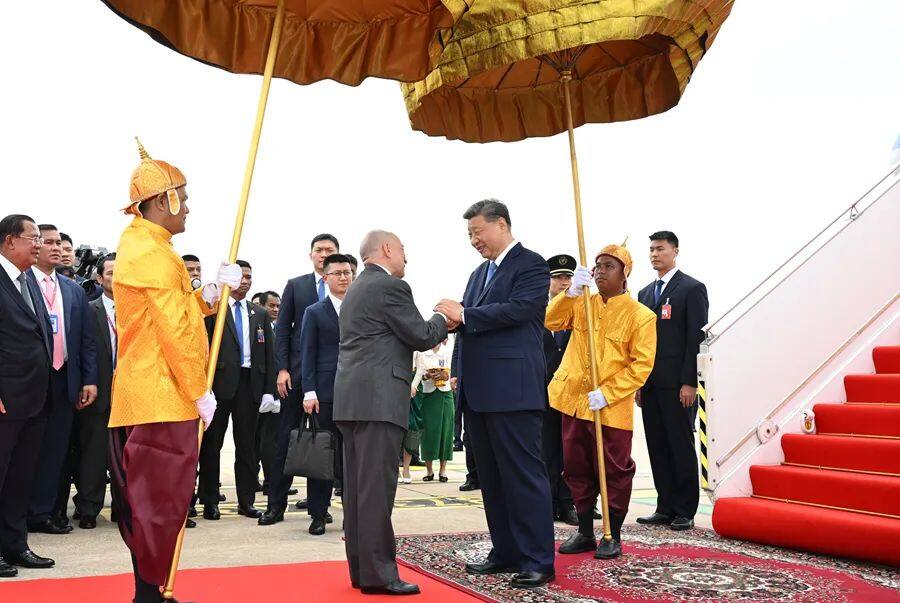 习近平主席抵达后发表了书面讲话。正值柬埔寨传统新年这一特殊时刻,习近平主席向柬埔寨政府和全体人民致以最美好的新年祝福。习近平主席深刻指出,中柬两国关系源远流长,由两国老一辈领导人亲手缔造并精心培育,历经国际风云变幻的重重考验,始终坚如磐石。两国在诸多领域成就斐然,率先构建双边命运共同体,率先开展共建一带一路合作,在维护各自国家稳定、推动发展繁荣的伟大事业中相互支持、携手共进,在捍卫国际公平正义的斗争中紧密团结、协作配合,为构建新型国际关系树立了典范,为推动构建人类命运共同体贡献了重要力量。习近平主席还表示,期待与柬埔寨领导人深入交流,共叙多年深厚友谊,共谋未来发展蓝图,不断充实中柬 “钻石六边” 合作架构,进一步深化战略协作,为两国人民带来更为丰厚的福祉,为地区乃至世界的和平稳定注入更多积极正能量。