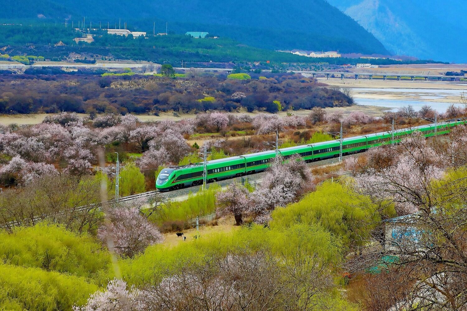从拉萨启程,拉林铁路沿线的风光如画卷般在眼前铺展。起初,连绵雪山如银色巨龙横亘天际,与初绽的桃花相互映衬;待列车驶入林芝境内,野生桃花迎来盛放期,漫山遍野皆是粉白花海。“车在花中跑,人在画中游”,疾驰的高原“复兴号”与铁道旁的桃花,共同勾勒出人与自然和谐共生的诗意画面。林芝站安检员德吉拉姆感慨:“第一次看到复兴号飞驰而过,就像看见家乡的雄鹰掠过雪山。”