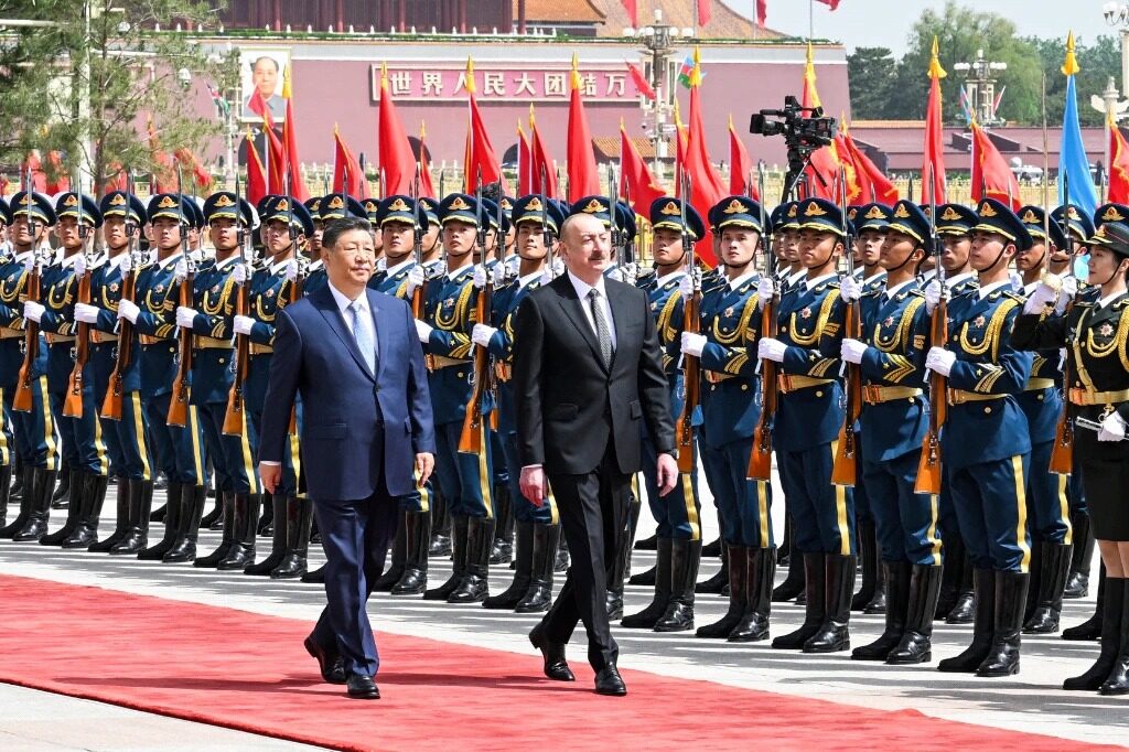 阿利耶夫抵达时,礼兵列队致敬。习近平同阿利耶夫登上检阅台,军乐团奏中阿两国国歌,天安门广场鸣放21响礼炮。阿利耶夫在习近平陪同下检阅中国人民解放军仪仗队,并观看分列式。
