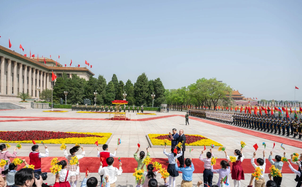 会谈前,习近平和夫人彭丽媛在人民大会堂东门外广场为阿利耶夫和夫人阿利耶娃举行欢迎仪式。
