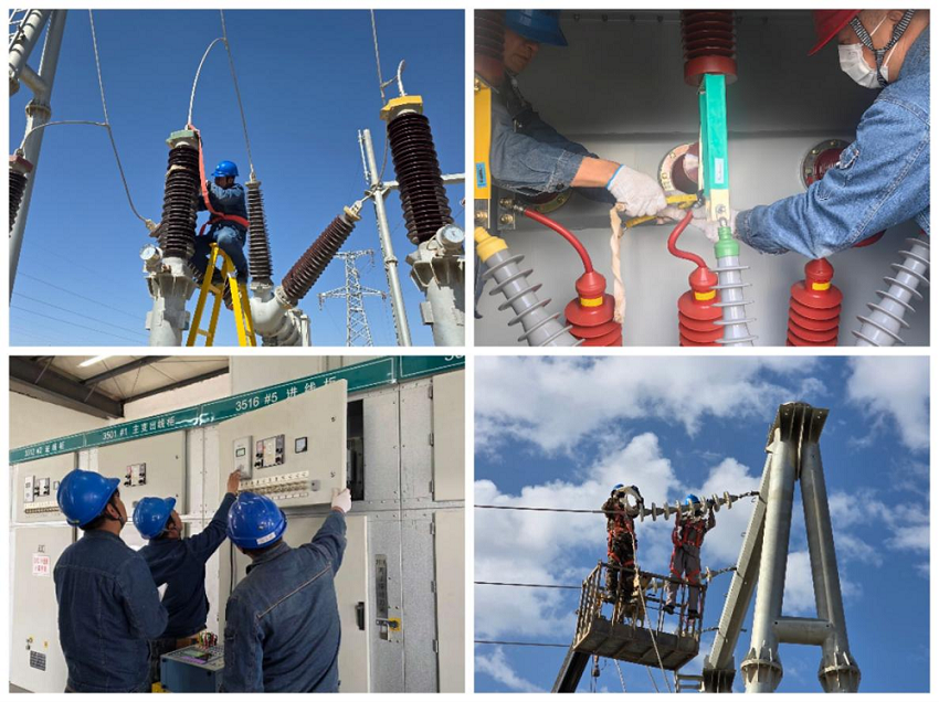停电检修期间,现场安全围栏和警示标志规范醒目、作业区域界限清楚、设备工器具摆放有序,各环节紧密配合,高效推进。检修工作小组有序完成了110kV升压站一、二次设备的预防性试验及设备缺陷消除工作。对110kV升压站高压开关柜进行了全方位检查和维护,主要完成了1#主变的预试,1#站用变及消弧线圈连接变呼吸器干燥剂更换,确保其安全可靠运行。对21台箱变开展了绝缘电阻测试,高、低压直阻试验等,及时处理发现的问题更换低压侧避雷器7个。完成60台变压器进行取油样工作,通过对油样的检测分析,精准判断设备运行状态,为后续维护提供科学依据。同时,高台光伏电站也利用此次停电机会,同步开展“设备焕新”行动,完成了1#主变高压侧6串绝缘子RTV-2型防污闪涂料的喷涂工作,对站内开关柜、端子箱、检修箱、SVG无功补偿装置本体等设备进行全面吹灰清扫,细致清除设备表面及内部积灰、油污等隐患,进一步保障了电站设备的安全稳定运行。