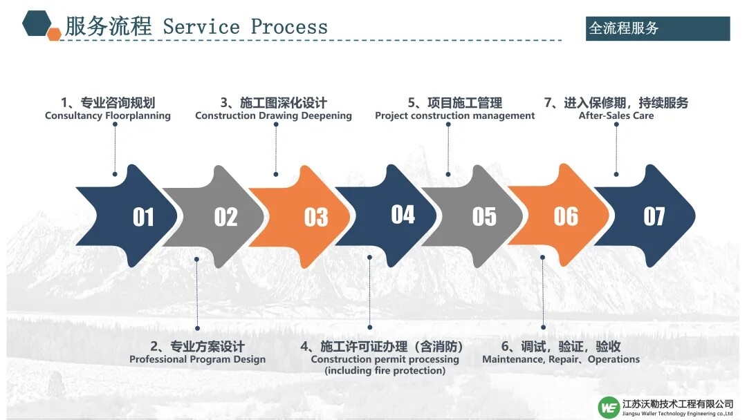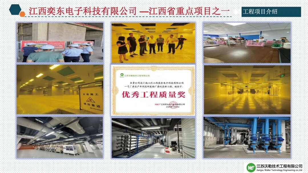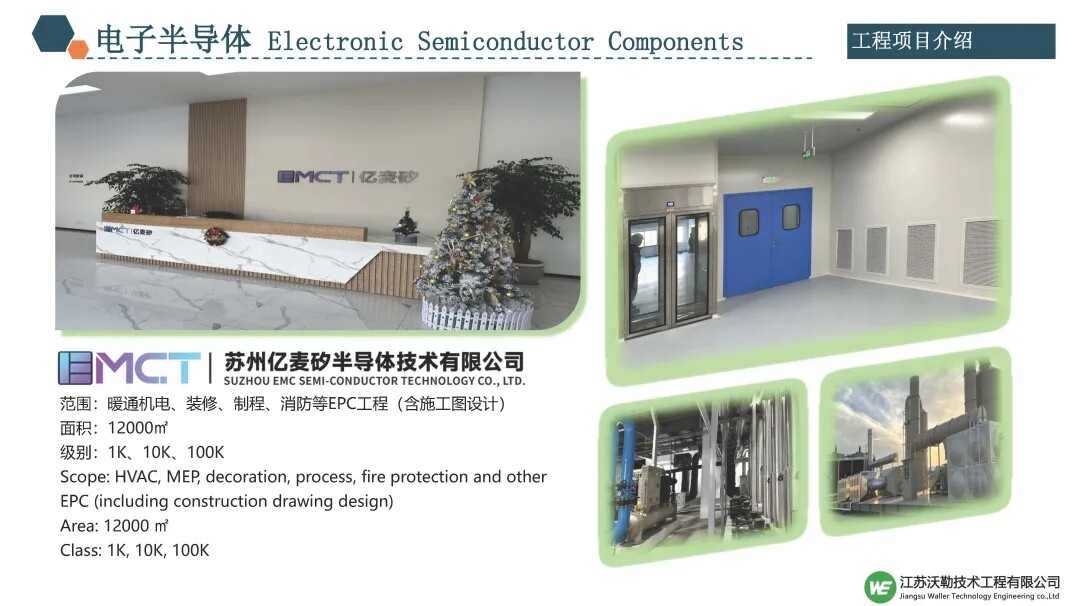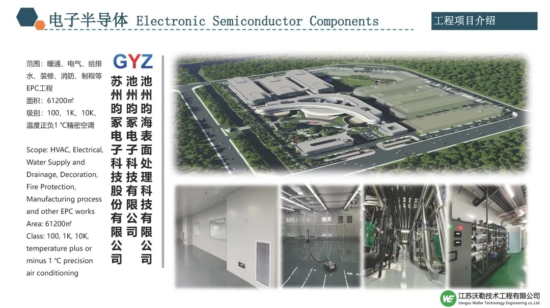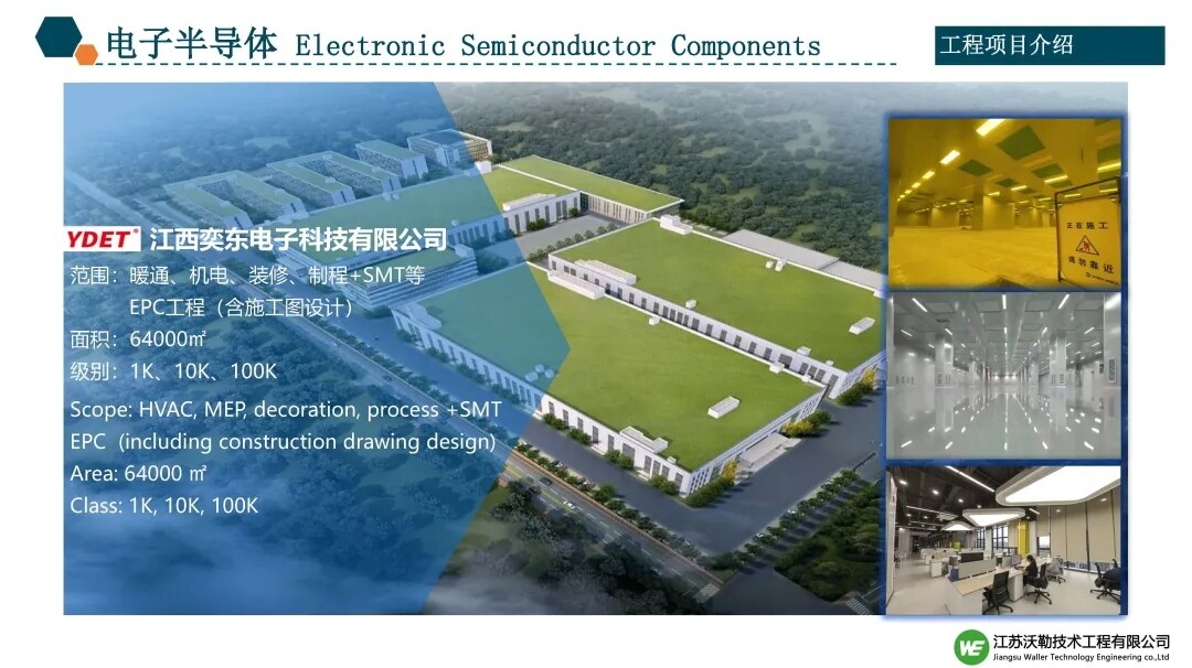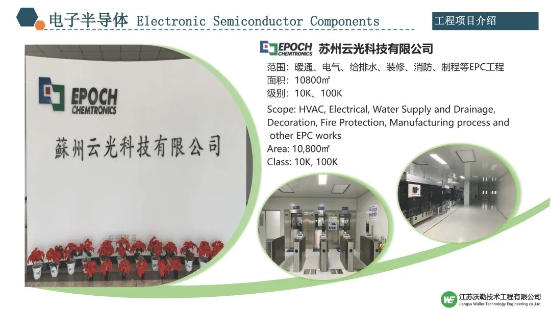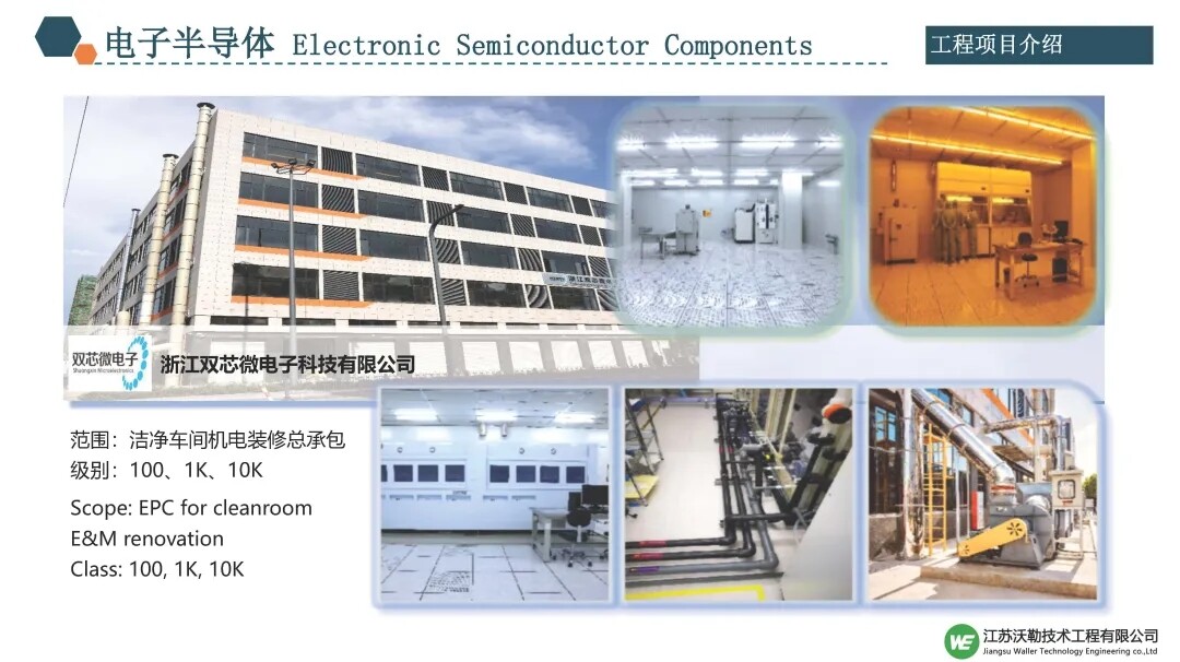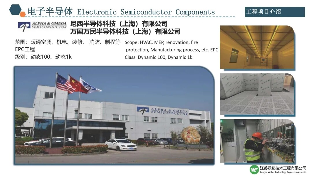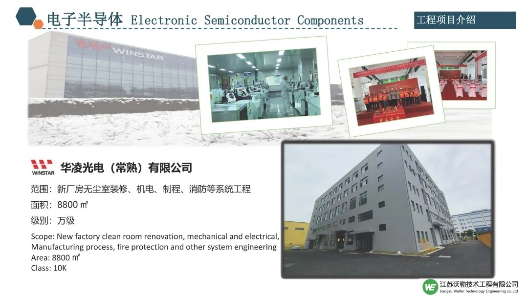 江苏沃勒技术工程有限公司是一家拥有行业领军无尘室技术,专注于无尘室机电装修总包工程的高新技术企业。公司的设计和施工团队多年深耕于技术最前沿,服务领域涵盖电子半导体,生物医药,精密器械,航空航天,化妆品化工和食品饮料等行业,在业界拥有良好口碑,赢得了广大客户的信赖与支持。