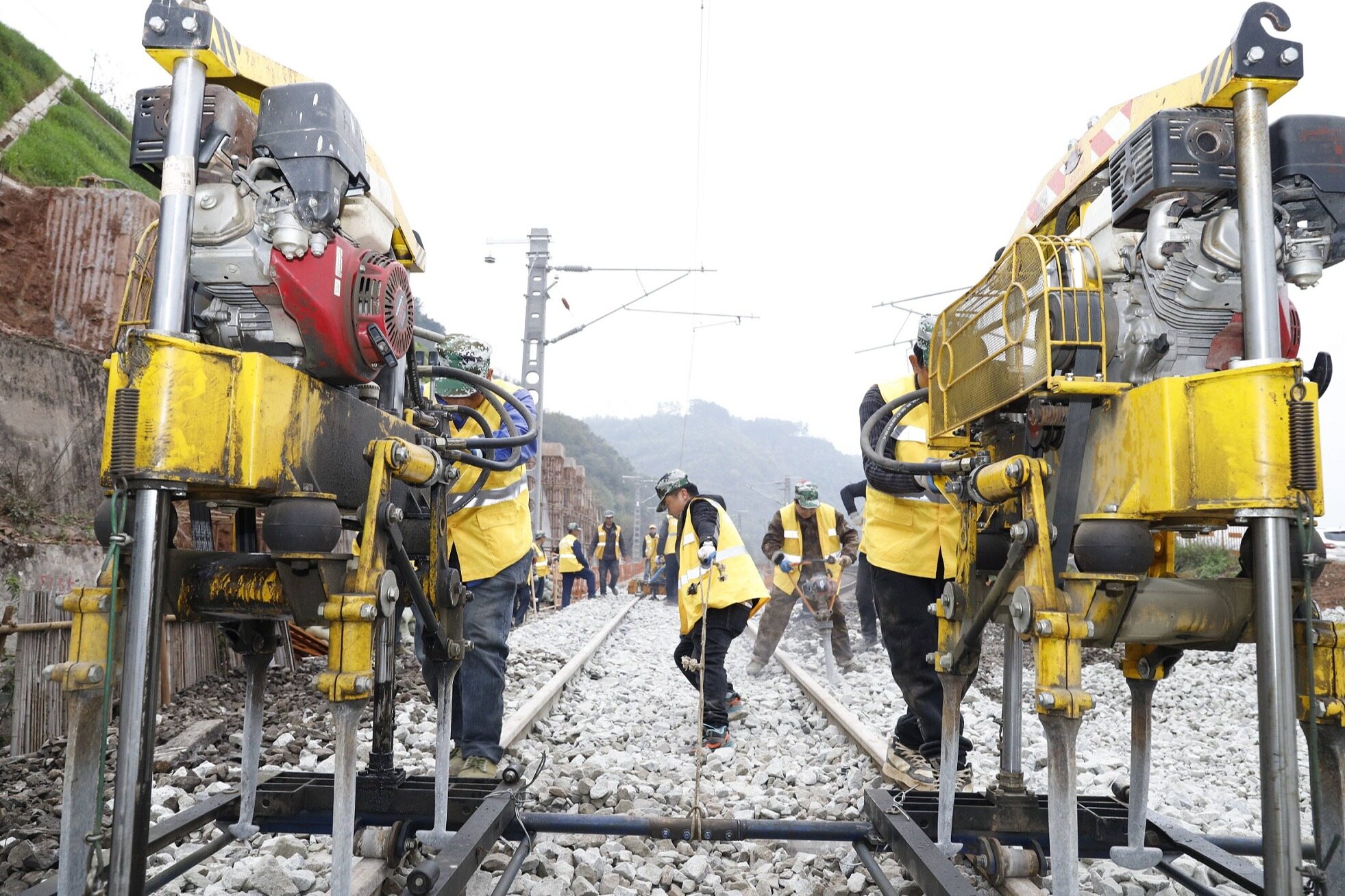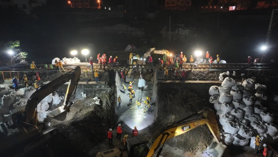 10日凌晨1时许,成渝铁路改造工程重庆站至江津站段——K441+150、K441+410两处大开挖施工现场防护排架旁人潮鼎沸,器械喧鸣,成渝项目干部职工整装待发,一场“铁路涵洞大开挖”施工即将拉开帷幕。2时55分,随着“封锁”命令的下达,作业人员严格执行专项施工方案作业流程,确认安全后迅速跨上线路,指挥声、工具碰撞与机械轰鸣交织,打破凌晨的寂静,各专业按照方案要求,进行光电缆防护、路堤开挖、基底找平、涵身拼装、防水铺设、级配回填、道砟回填、线路捣鼓等工序衔接自然、一气呵成。至上午8时30分,本次II级大天窗涵洞开挖任务提前20分钟完成。