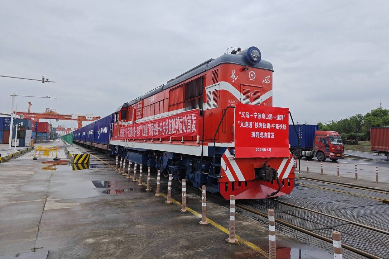 5月18日,采用“铁海快线+中东(迪拜)快航”这一“双快”物流模式的义乌至迪拜出口货物首单当日成功发运。