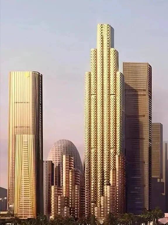 五座塔楼参差错落的布局构成"向海而生"的整体意象。主塔以雕塑般的形态拔地而起,四座高度80米至105米的副塔簇拥环绕,呼应了深圳的海洋文化特质。这种布局打破了传统超高层的封闭格局,通过底层开放式广场、文化空间和绿色连廊,将建筑与城市公共空间无缝衔接,形成办公、商业、酒店与文化设施融合的多功能综合体。