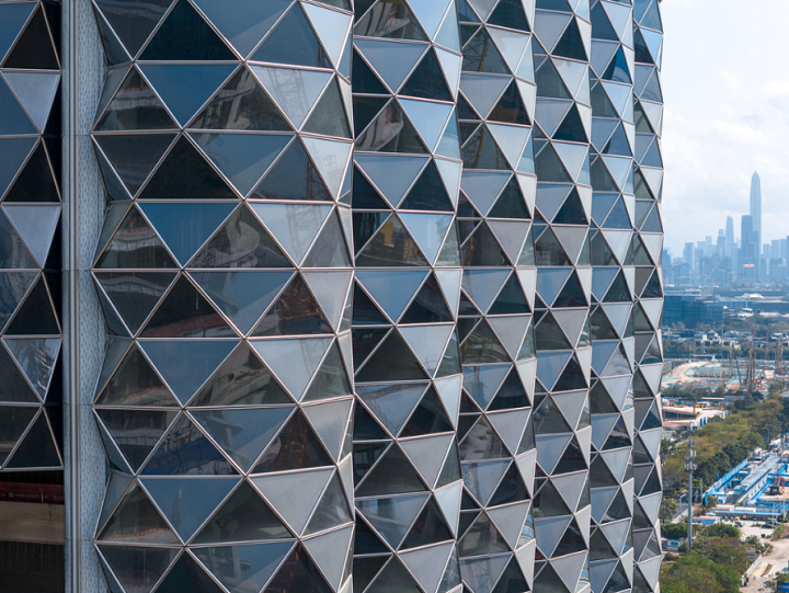 建筑外立面的大面积三角形几何凸窗设计灵感源自中国传统折纸艺术,玻璃幕墙通过精密的角度计算,既减少了阳光直射带来的热负荷,又创造出独特的视觉韵律。白天,幕墙在阳光下如钻石般璀璨;夜间,嵌入式的智能LED照明系统通过动态光影变幻,将"钻石切割"的立体感延伸至城市夜空,成为深超总片区最耀目的视觉焦点。