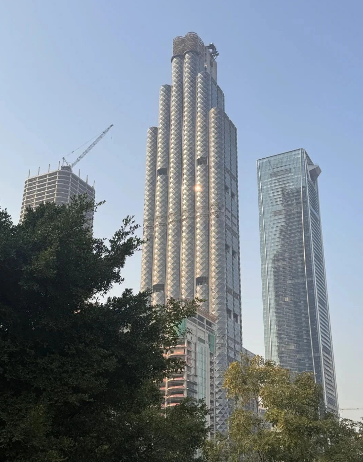 大厦项目的幕墙工程作为建筑最吸睛的部分,由近1.4万个曲面三角玻璃单元组成,每个单元都经过3D建模精密计算。施工团队通过无人机扫描与算法模拟,将2.5万平方米异形幕墙的安装误差控制在毫米级,创造了国内超高层幕墙施工精度的新标杆。建筑累计消耗钢筋6万吨、钢结构4.2万吨、混凝土32万立方米。