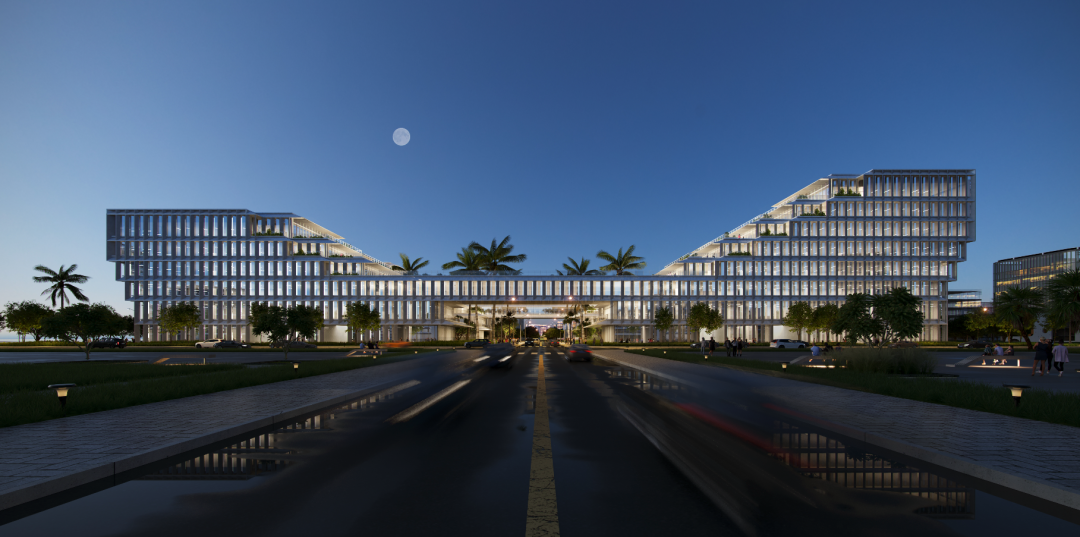项目南北地块建筑一、二层采用局部架空形式,这一设计保证了南北向中央轴线的贯通,使得整个园区在视觉上更加开阔、通透。