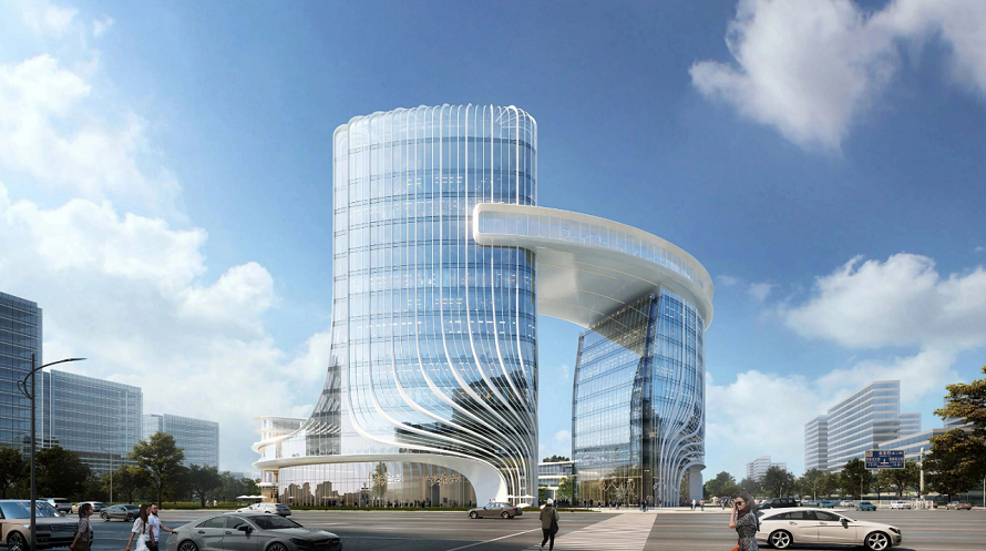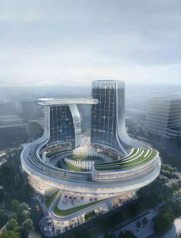 建筑设计以 “羽宙” 为核心理念,灵感源自羽毛的轻盈形态与微观结构。主体建筑由两栋塔楼和裙房组成,最高 15 层,总建筑面积 7.78 万平方米。