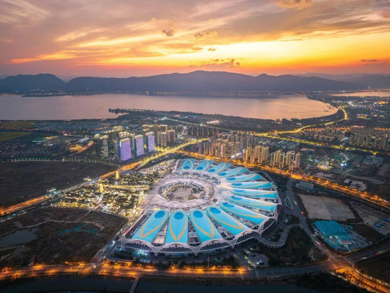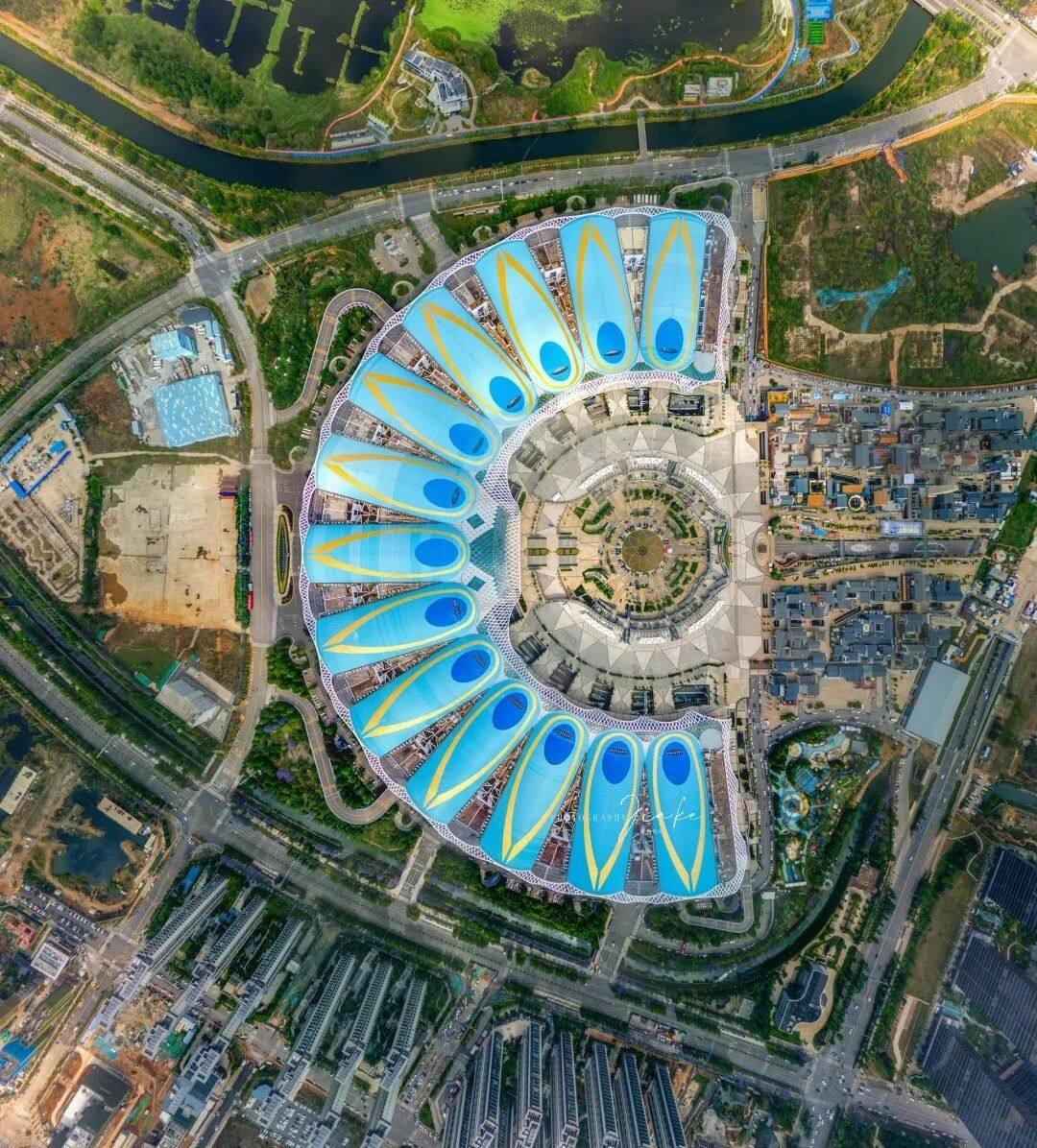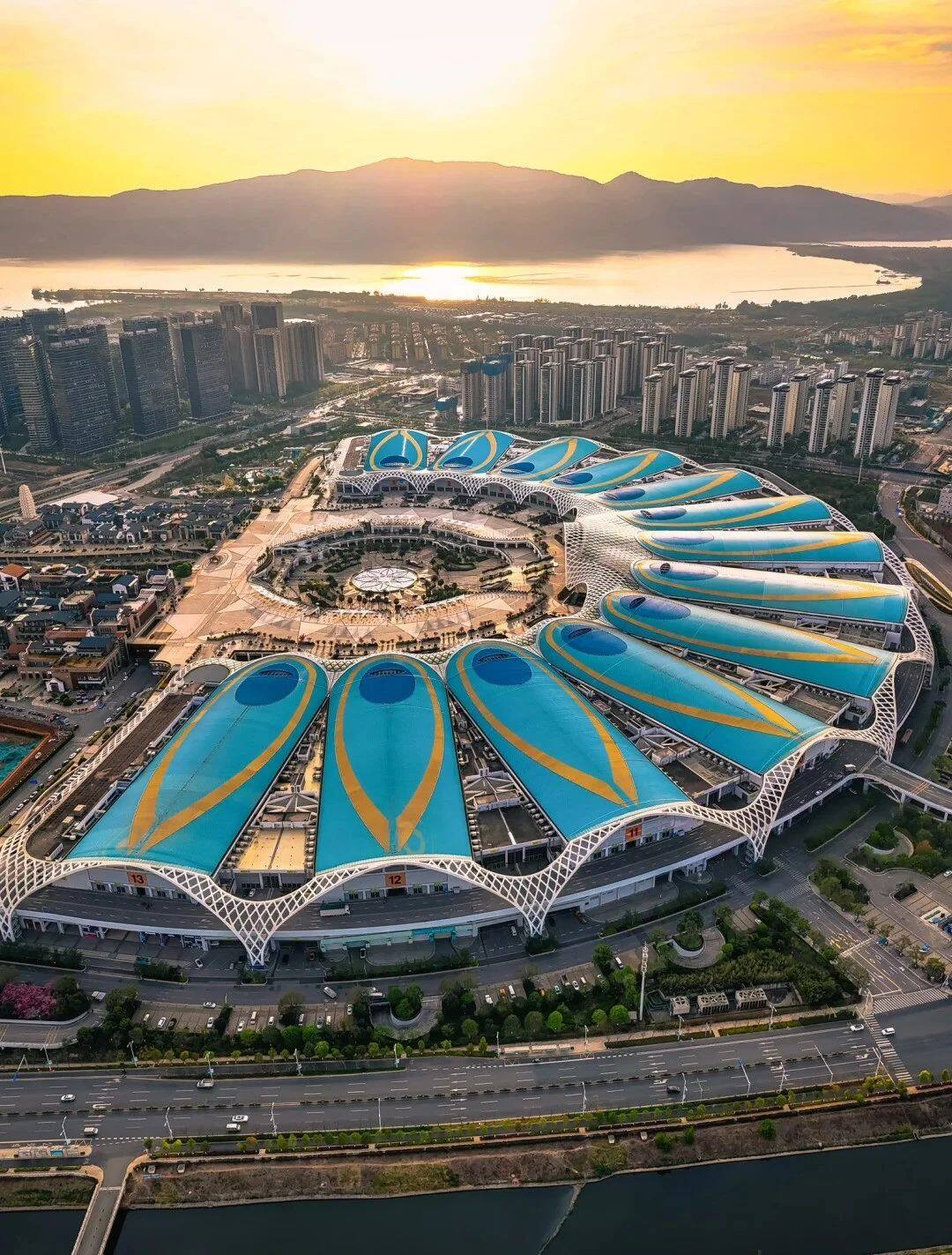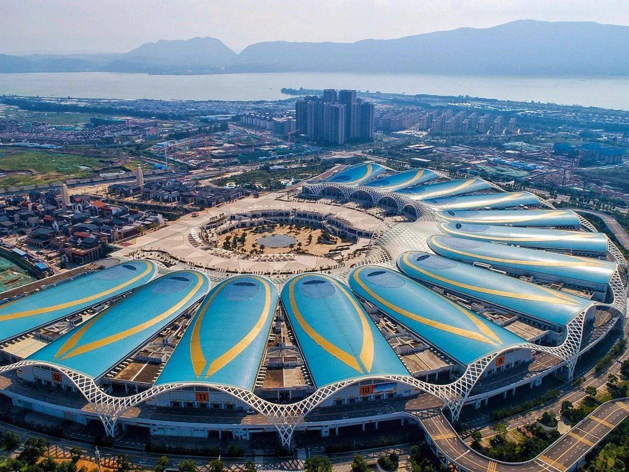 昆明滇池国际会展中心始建于2015年,地处云南省昆明市,占地540万平方米,一期建筑面积117万平米,建筑群以“孔雀展屏、祥瑞春城”为核心理念,13个展馆的屋顶轮廓模拟孔雀尾羽的扇形展开,从空中俯瞰宛如一只巨型孔雀在滇池畔开屏。