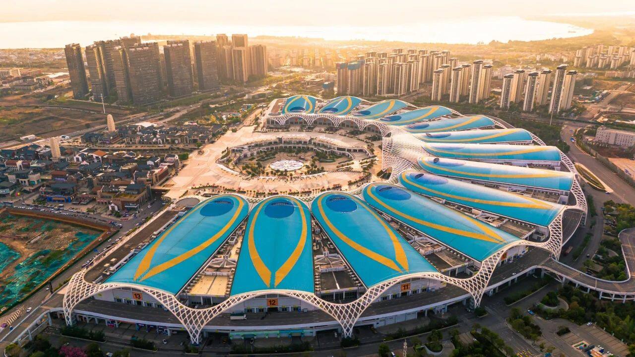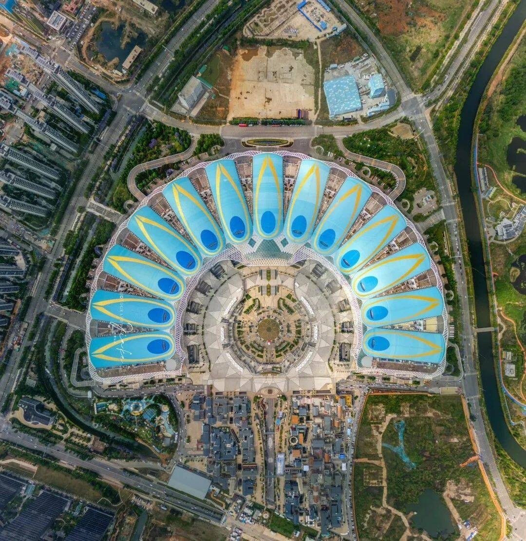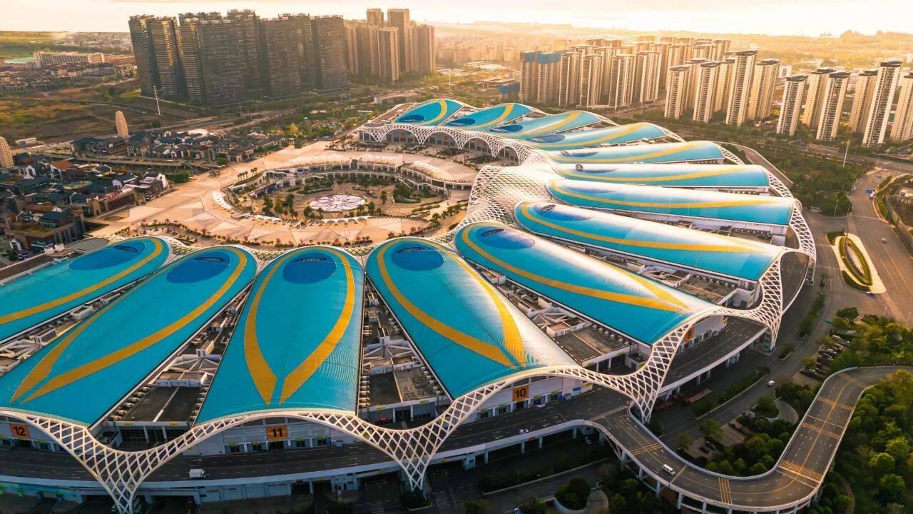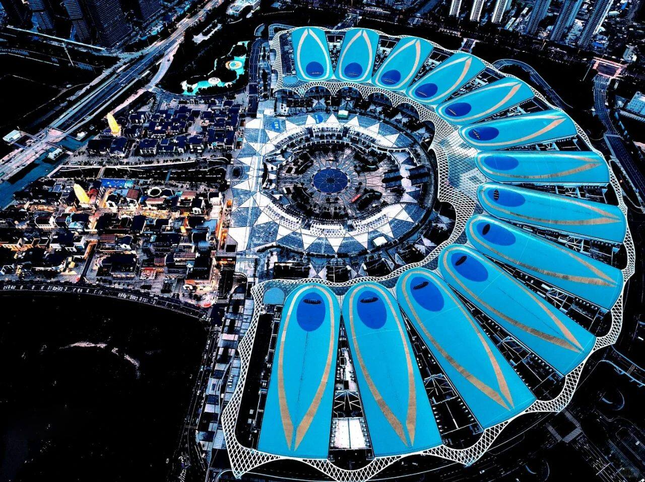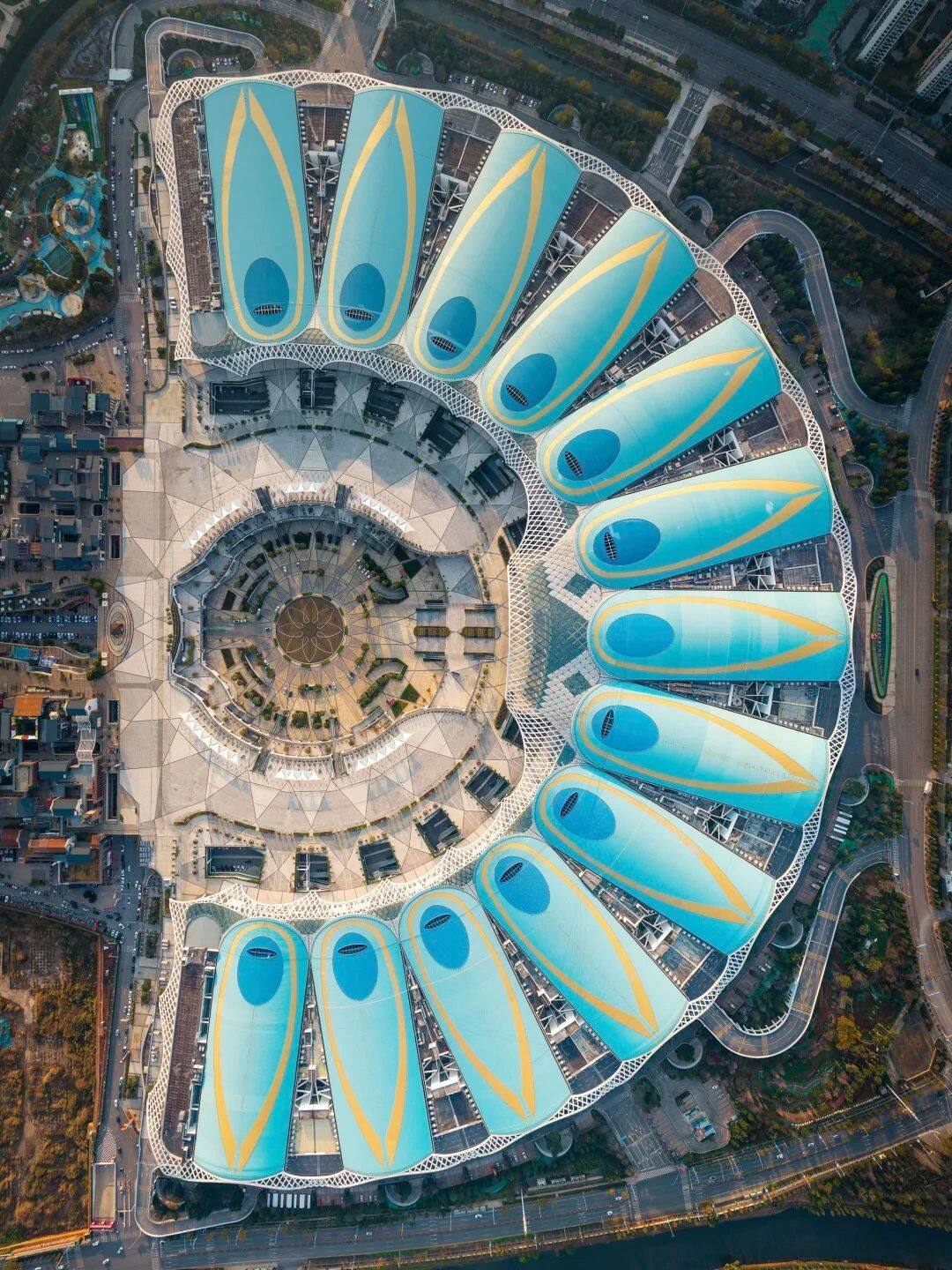 网友拍摄的航拍图显示,暮色中的会展中心如同“机械孔雀”抖落钻石般的光斑,被盛赞为“自然与科技的共生体”。