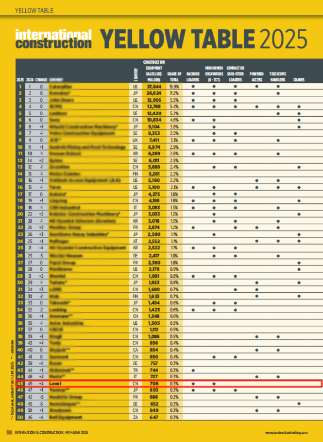 近日,全球工程机械行业权威资讯机构KHL旗下的《International Construction》杂志发布了备受瞩目的《Yellow Table 2025》榜单。中国工程机械企业雷沃重工在此次榜单中表现卓越,以7.06亿美元的销售额跃居全球第45位,较2024年大幅提升了4个名次,进一步彰显了其在工程机械行业的硬核实力。