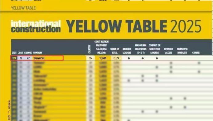 英国KHL旗下《国际建设》杂志发布的2025年Yellow Table显示,山推股份在全球工程机械制造商排名中从2024年的第31位上升至第29位,这一跃升不仅彰显了山推股份在全球市场的竞争力,也反映了山推在2024年取得显著成绩。