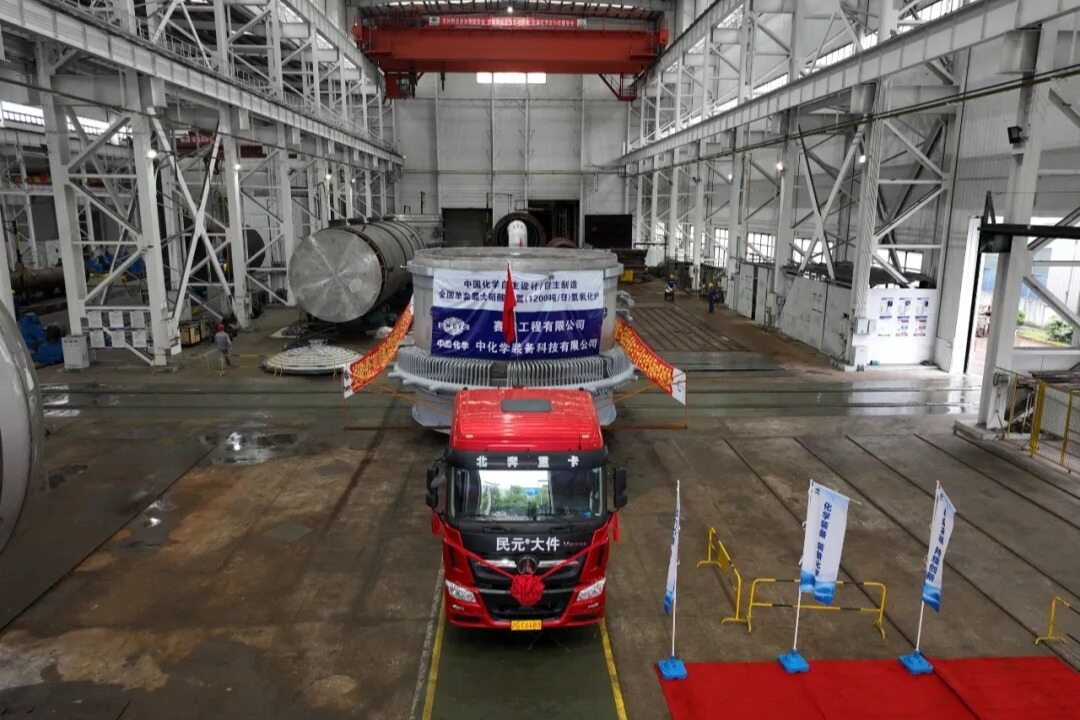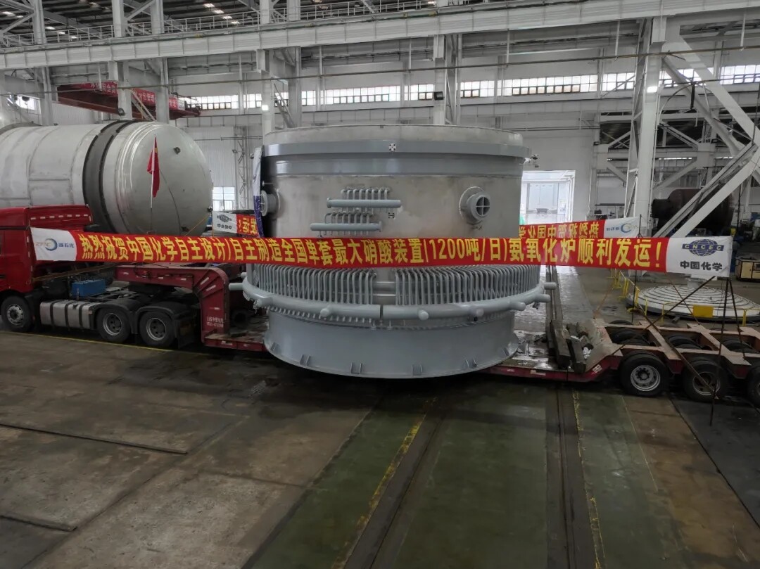 6 月 8 日,由中国化学赛鼎公司提供专有设备技术、装备科技公司完成制造的全国单套最大硝酸装置(1200 吨 / 日)—— 浙石化高端新材料硝酸装置核心设备硝酸氨氧化炉,在上海顺利发运。