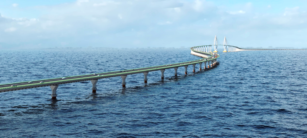 项目创新采用世界最深桩基和首创的超长联连续刚构结构,主桥为12.4公里斜拉桥,双向六车道设计。大桥横跨万圣海湾,连接萨尔瓦多市与伊塔帕里卡岛,将两地通行时间缩短80%,预计带动沿线旅游、物流等产业升级。