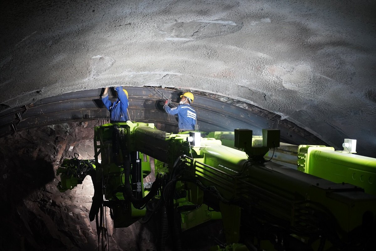 同时,创新应用“五车一桥”施工工法,优化流程,提升效率。拱架自动生产线和格栅钢架全自动生产线的投产,显著提高了预制构件的精度和生产效率。配备全工况湿喷机械手等智能化装备,有效降低了人工操作风险,为复杂地质条件下的安全施工构筑了坚实屏障,有力保障了工程建设的高质量推进。针对隧道多处浅埋下穿采石场的特殊段落,项目部综合运用地震波反射法、地质雷达扫描、瞬变电磁法等立体探测技术,精准获取前方地质信息。项目总工程师李文介绍:“施工中严格遵循‘短进尺、强支护、快封闭、勤测量’原则,依托围岩变形自动监测系统实时开展监控量测,强化超前支护措施,成功安全穿越多处浅埋采石场段落,最终实现全隧贯通。”
