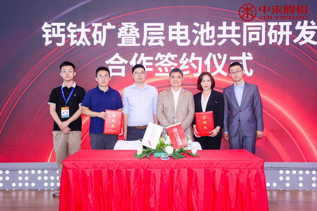 中来股份与纤纳光电科技有限公司正式签署了钙钛矿叠层电池共同研发合作协议。纤纳光电科技有限公司的颜步一先生与中来股份的季晓红女士分别代表双方签署了合作协议。纤纳光电的姚冀先生与中来股份的林建伟先生作为双方高层领导出席签约仪式并见证了这一重要时刻。此次合作标志着双方将在钙钛矿叠层电池这一前沿技术领域展开深度合作,共同推动光伏技术的创新与发展。