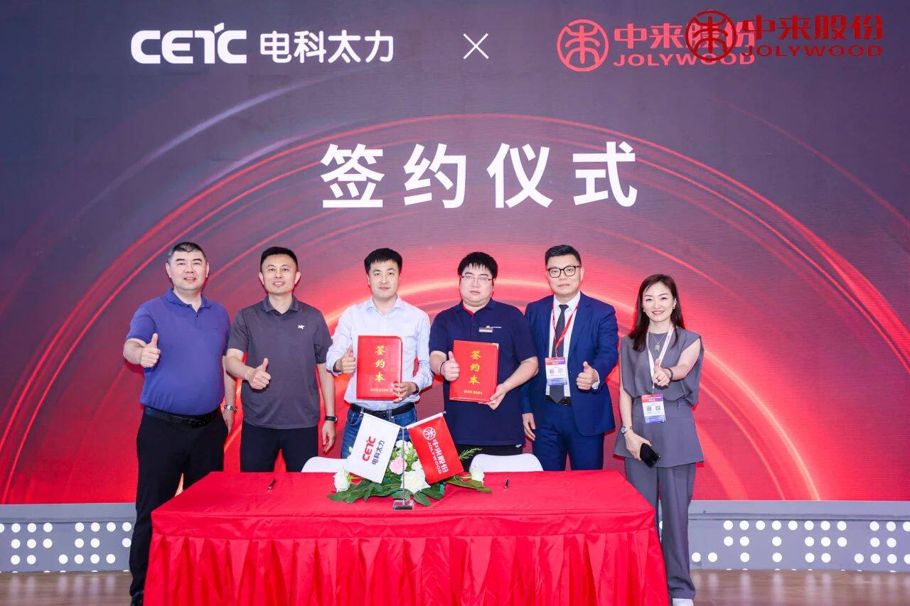 中来股份与中电科太力通信科技有限公司签署战略合作协议。中电科太力通信科技有限公司的刘政国先生与中来股份的郭昊先生分别代表双方签署了合作协议。中电科太力的娄培墅先生与中来股份的邹驰骋先生作为双方高层领导出席签约仪式并见证了这一重要时刻。