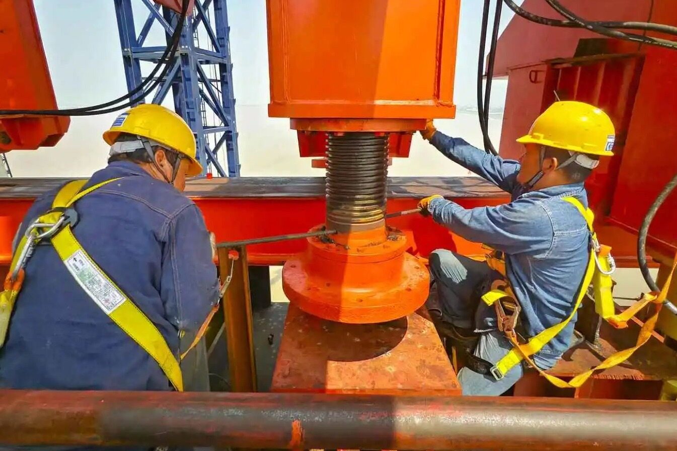 此次主通航孔桥首个钢梁架设采用顶推架设的方式,即预制钢梁吊装后沿着滑道推移就位。此次吊装的钢梁截段也是崇启公铁长江大桥目前吊装的最大重量的钢梁截段,施工精度要求高,水上施工难度大。