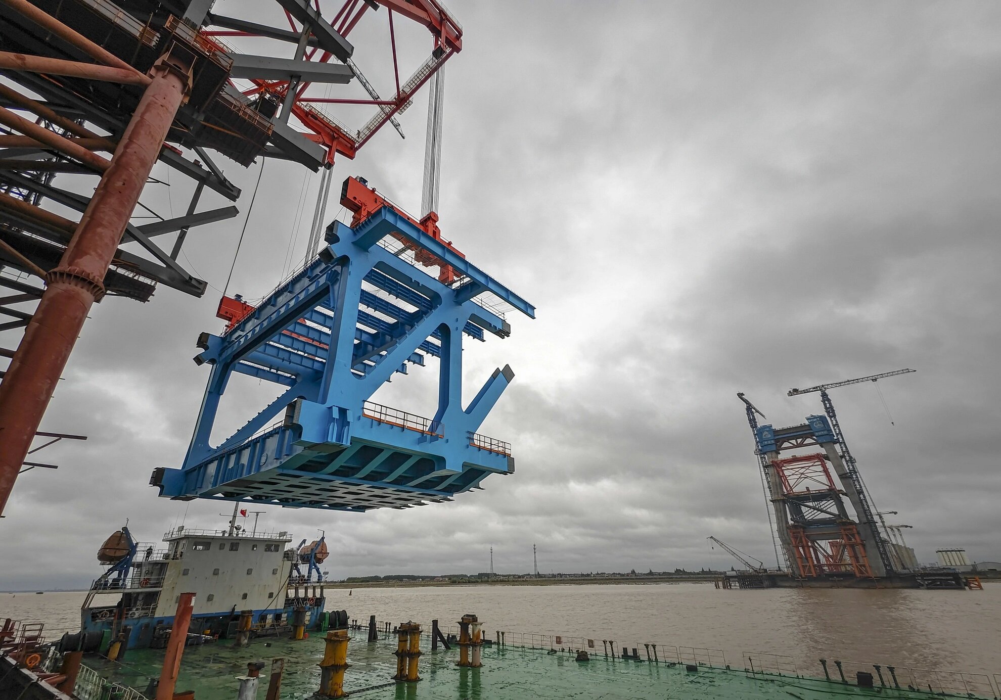 在崇启公铁长江大桥3号主墩旁,一艘水工船稳稳停泊,船上装载着重达890余吨的主通航孔桥上海侧首个钢梁截段。1100吨橙色架梁吊机架设在钢梁之上,准备开启吊装架设。据了解,主通航孔桥首节钢梁吊起以后,将会与导梁相连,并推向1号桥墩。