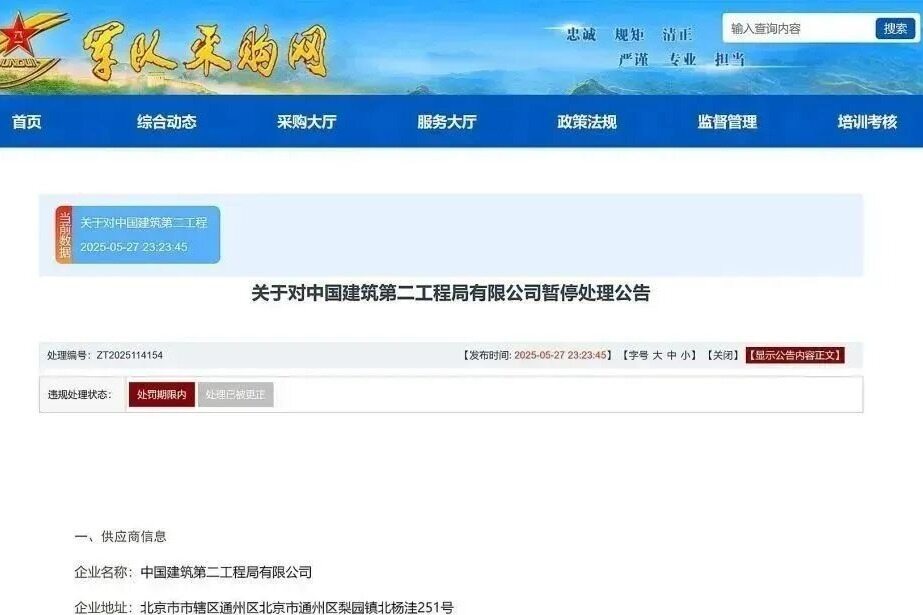 军队采购网发布的一则公告引发社会广泛关注:中国建筑第二工程局有限公司因在2019年和2020年参与军队多个项目时存在围标、串标等严重违规竞标行为,同时违规转包项目,且在调查过程中拒不配合核查,被暂停参加全军物资工程服务采购活动资格。