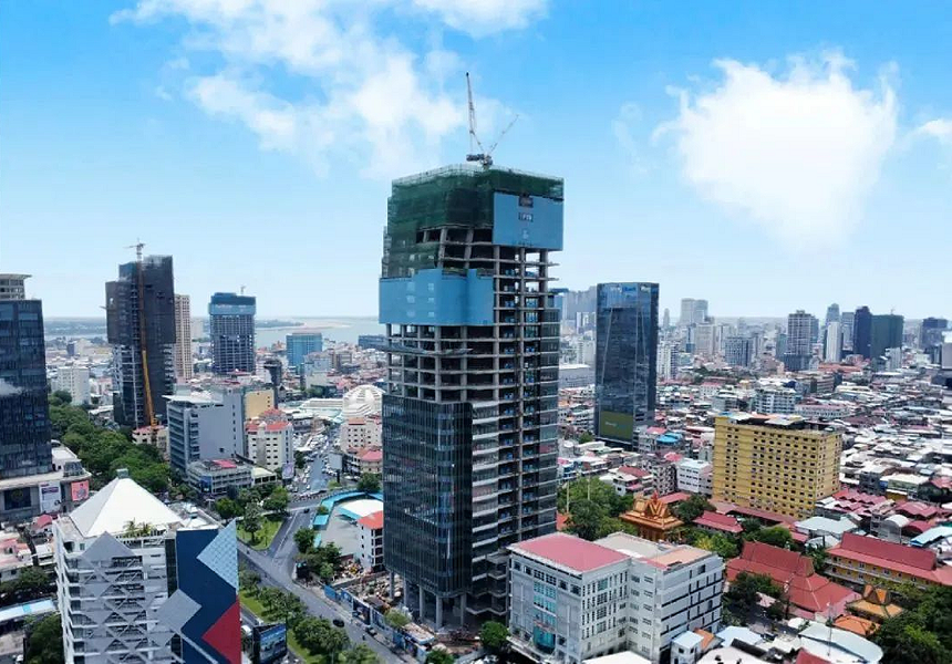 2025年6月13日,柬埔寨外贸银行新总部——FTB Tower主体结构全面封顶,项目由中建三局一公司承建,是柬埔寨首都地标工程。