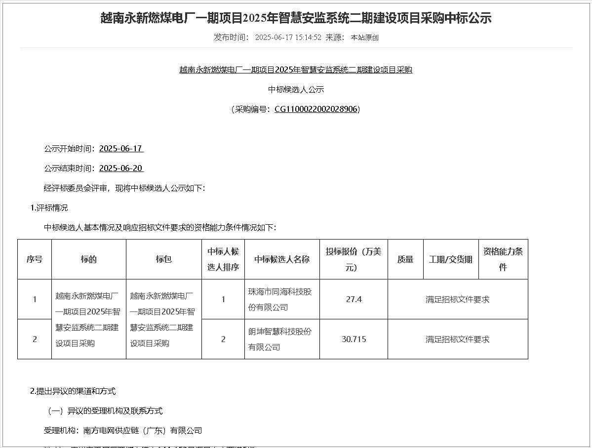 中国珠海市同海科技股份有限公司与朗坤智慧科技股份有限公司成功进入越南永新燃煤电厂二期智慧安全管控系统建设项目中标候选人行列,该项目标志着中国标准和技术在海外电力安全领域的进一步推广。该系统基于中国成熟的安防体系,结合越南当地法规,打造智能化、全流程安全管理新模式。