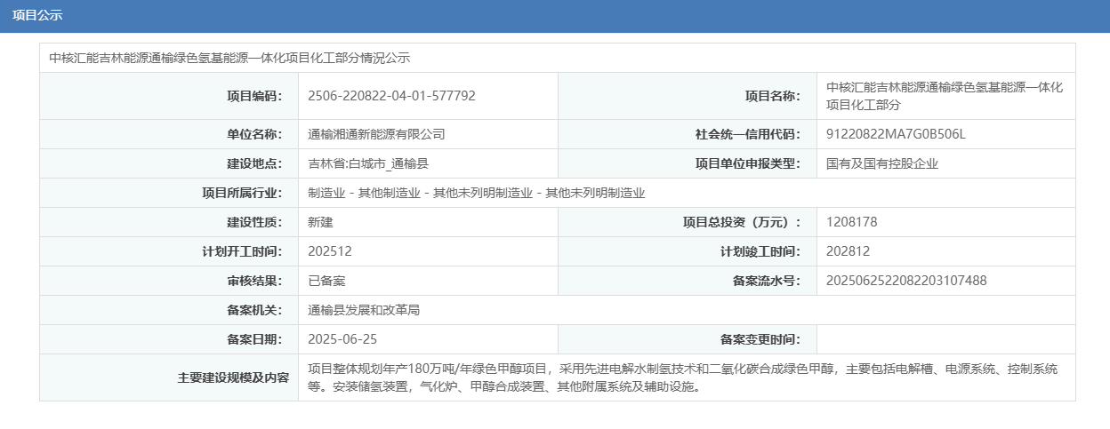2025年6月25日,中核汇能吉林能源通榆绿色氢基能源一体化项目化工部分备案。
