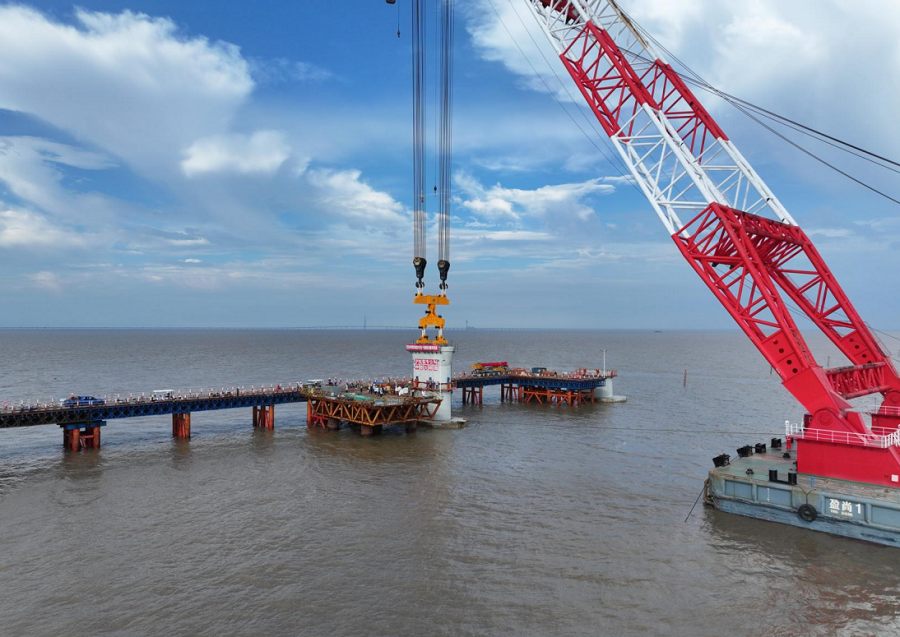 2025年6月29日,在由沪杭客专公司建设管理中铁大桥院和中国铁设联合设计中铁大桥局,承建的杭州湾跨海铁路桥中航道桥建设现场高7米、重达500吨的首节预制墩身节段,在“盈尚1”起重船的吊装下被精准架设到108号墩上。这是世界首次在强潮海湾复杂水文条件下完成大直径超长群桩基础装配式桥墩施工,不仅标志着我国高铁跨海桥梁建造技术的重大突破,也为今后同类工程积累了宝贵经验。
