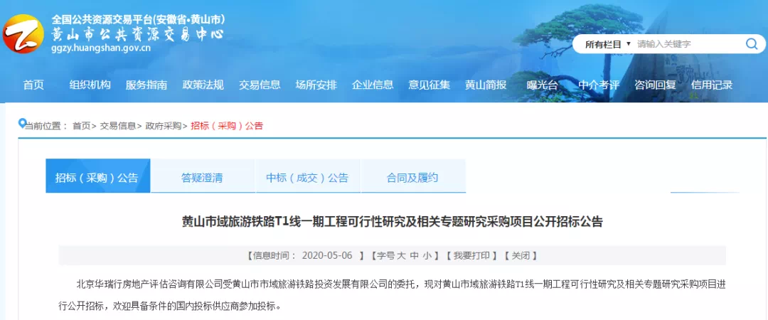 2020年5月6日,黄山市公共资源交易中心发布了《黄山市域旅游铁路T1线一期工程可行性研究及相关专题研究采购项目公开招标公告》,预示着黄山市旅游轻轨开工或进入倒计时状态!