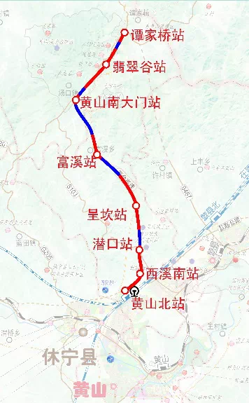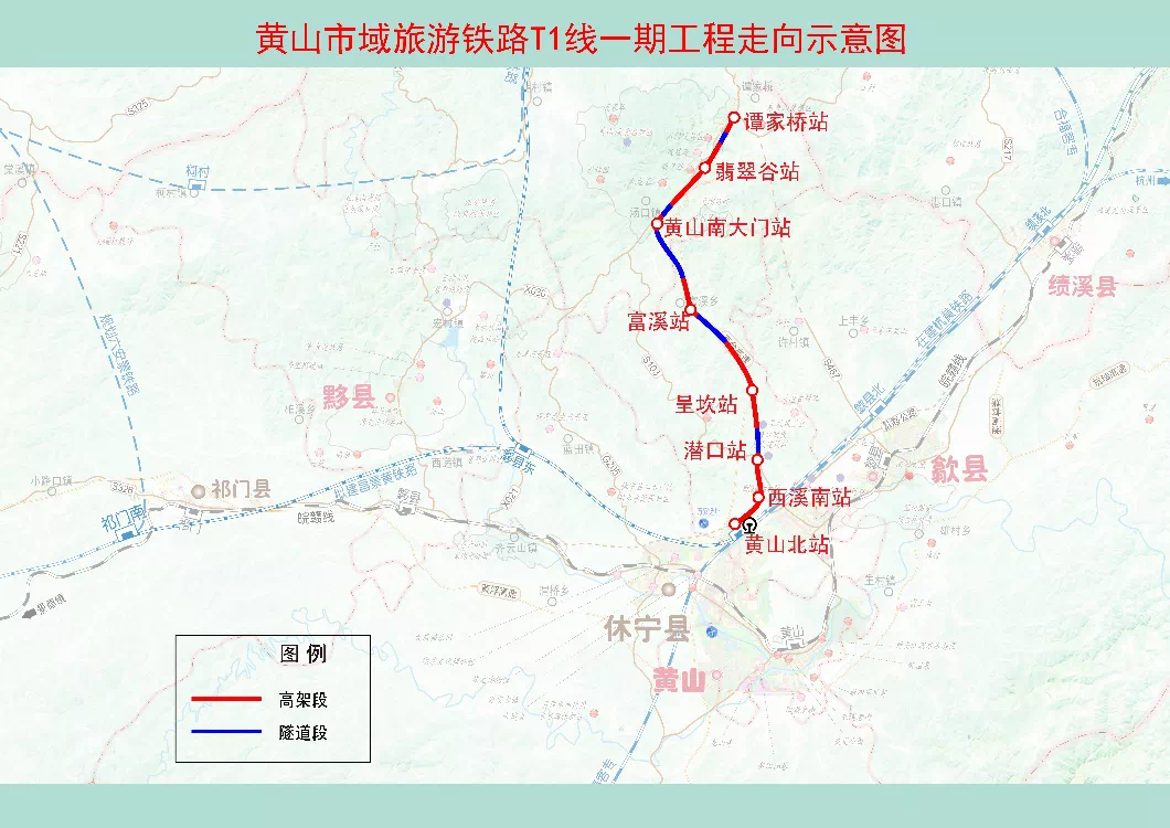 黄山市域旅游铁路T1线一期工程起自黄山北站综合交通枢纽,出站后线路向北前行,分别于西溪南古村落、潜口民宅(5A)、呈坎景区(5A)、富溪、黄山风景区、翡翠谷沿线景区设站,终于黄山东大门(5A)谭家桥镇。线路全长约47km,设站8座,平均站间距约6.6km。
