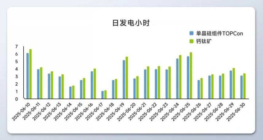 根据实际运行数据表明,尽管单晶硅TOPCon组件在弱光与温度系数上已优于单晶硅PERC,但在相同环境条件下,钙钛矿组件展现出更高的单位装机发电量和更长的等效发电时长。