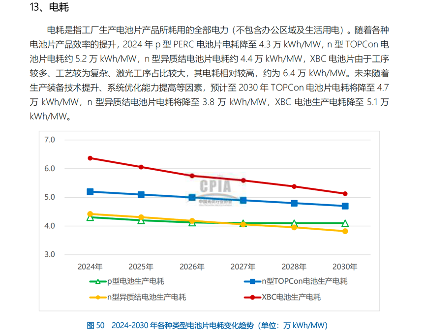 在降本提效的主题下,能耗是长期以来关注的重点。根据CPIA《中国光伏产业发展路线图》(2024-2025年)数据对比, HJT在电耗方面同样表现优异: