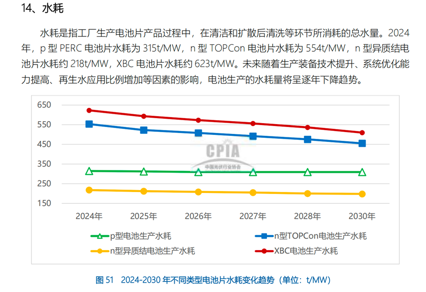 光伏产业的水资源消耗一直是行业关注的焦点。根据CPIA《中国光伏产业发展路线图》(2024-2025年)数据对比,HJT在水耗方面表现卓越: