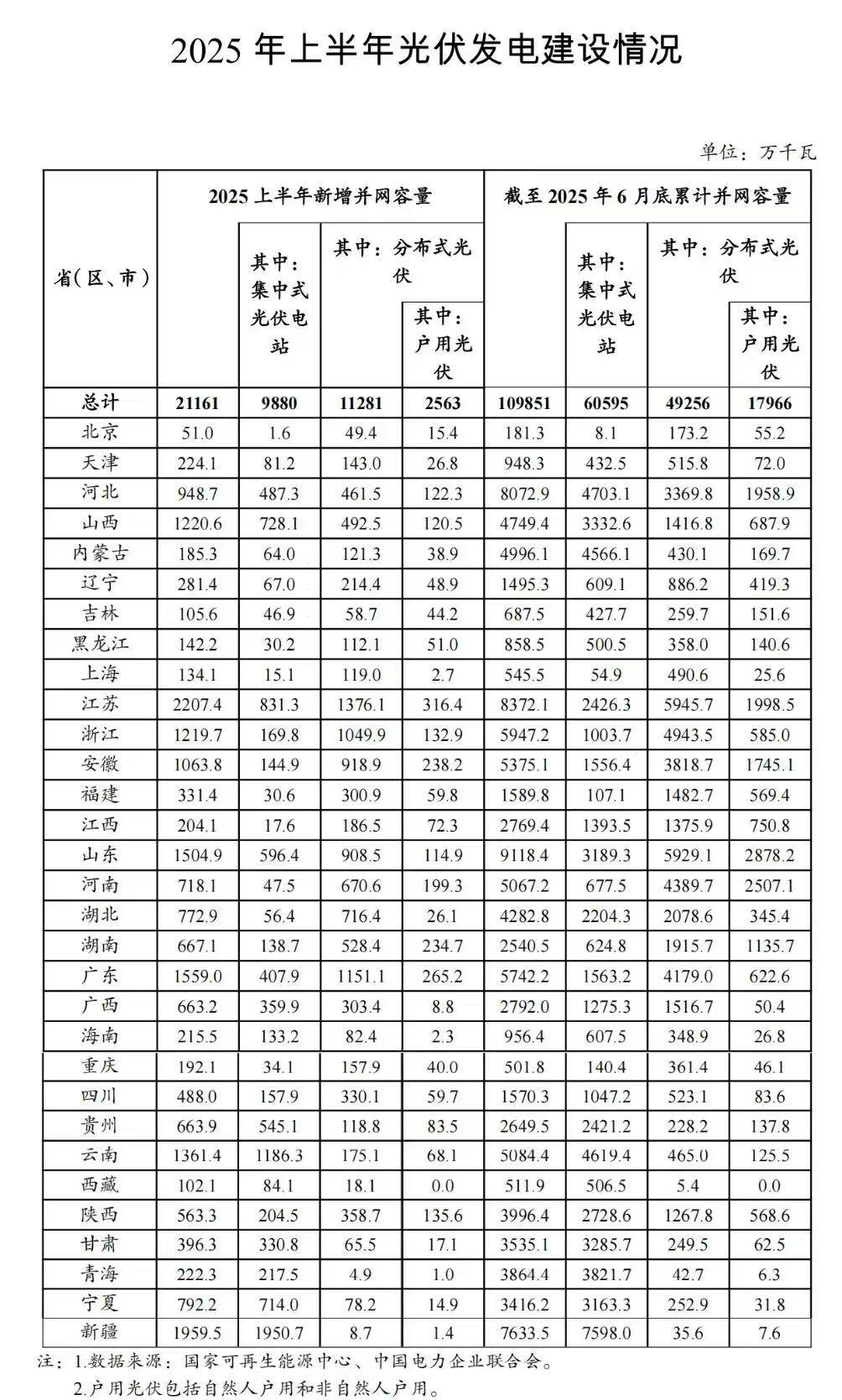 光伏发电:新增并网 2.12 亿千瓦(集中式约1亿千瓦、分布式1.13亿千瓦),累计装机11亿千瓦,发电量5591亿千瓦时,平均利用率94%。