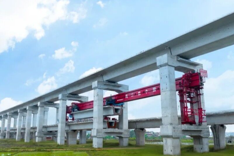 “应龙号”采用双跨架设的全新方案,在传统单主梁架桥机的基础上进行了模块化衍生设计,能够自由拆解并重组支腿结构,灵活切换施工模式。它既可以在极限条件下架设 460 余吨重的单线箱梁,也能在快速转换后,于常规条件下架设千吨级的双线箱梁。