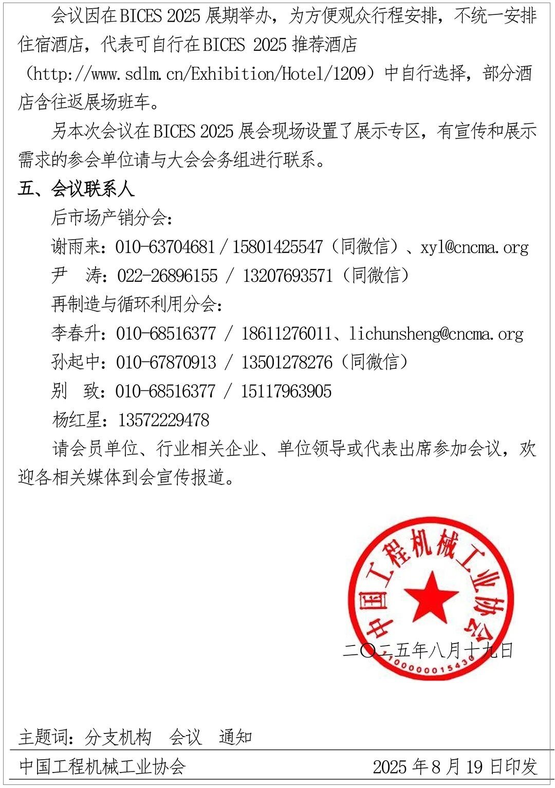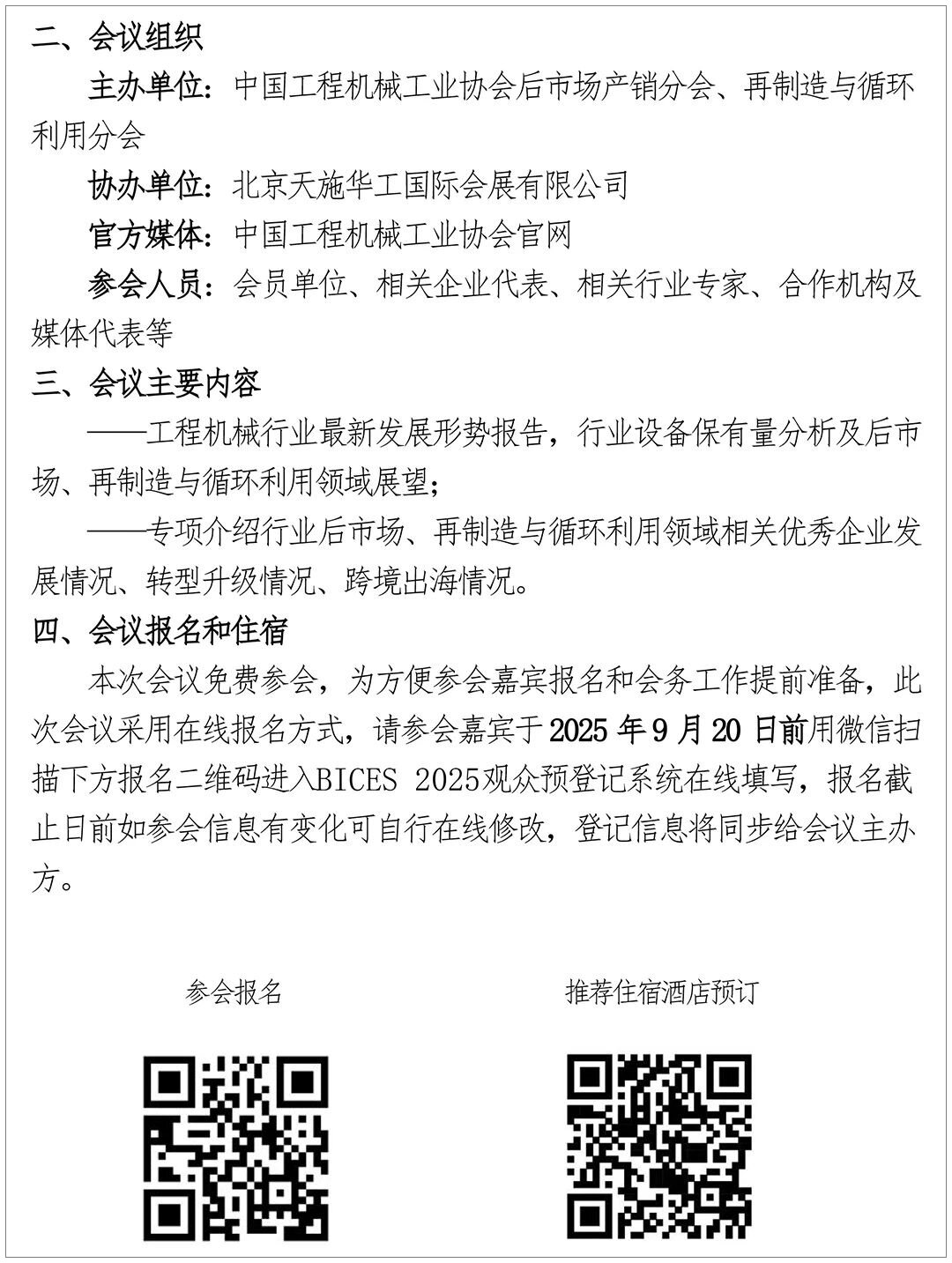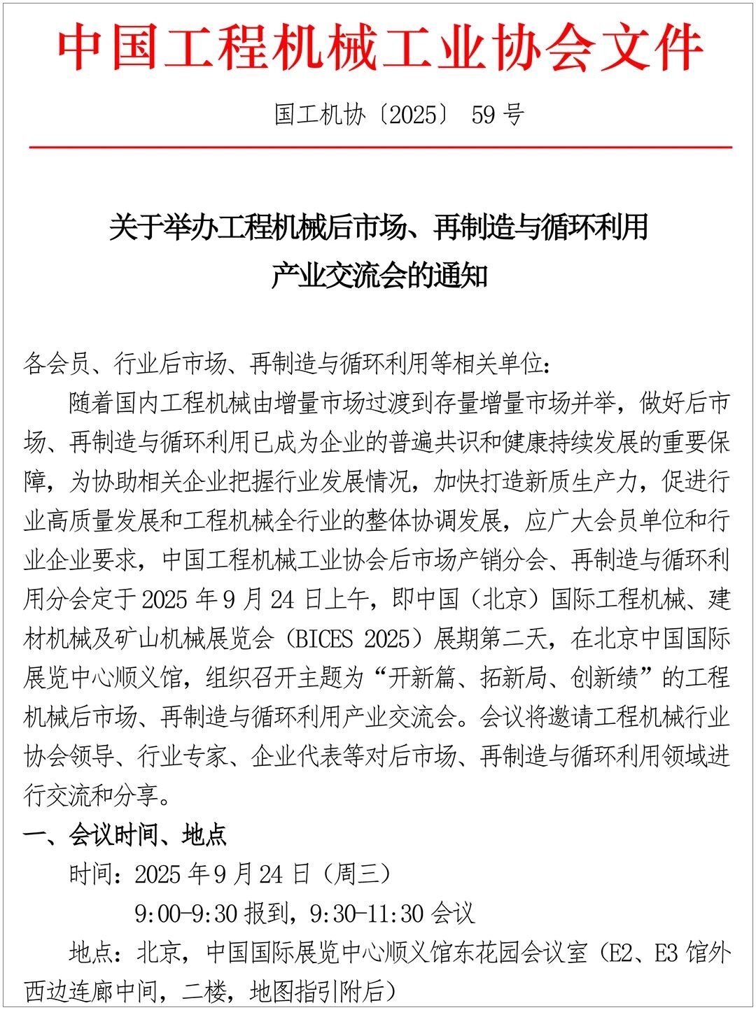 随着国内工程机械由增量市场过渡到存量增量市场并举,做好后市场、再制造与循环利用已成为企业的普遍共识和健康持续发展的重要保障,为协助相关企业把握行业发展情况,加快打造新质生产力,促进行业高质量发展和工程机械全行业的整体协调发展,应广大会员单位和行业企业要求,中国工程机械工业协会后市场产销分会、再制造与循环利用分会定于2025年9月24日上午,即中国(北京)国际工程机械、建材机械及矿山机械展览会(BICES 2025)展期第二天,在北京中国国际展览中心顺义馆,组织召开主题为“开新篇、拓新局、创新绩”的工程机械后市场、再制造与循环利用产业交流会。会议将邀请工程机械行业协会领导、行业专家、企业代表等对后市场、再制造与循环利用领域进行交流和分享。