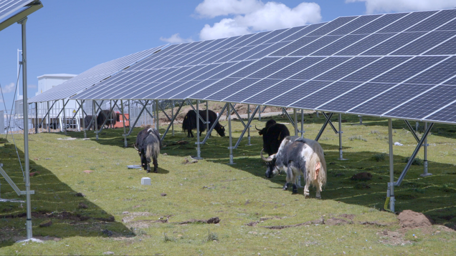 海拔4500米的拉杰雄山上,成群的牦牛正在华能加娃光储电站内悠闲地“散步”,品尝着光伏板下新鲜的牧草。藏族牧民吆喝着,赶着牛群走过光伏板间的通道,清脆的牛铃声在光伏阵列间回荡。