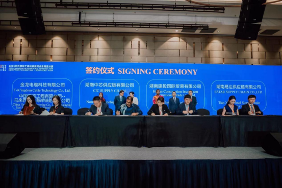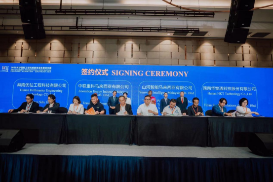 随后进行的签约仪式成果显著。在三一国际发展(马来西亚)有限公司、中联重科马来西亚有限公司、柳工机械亚太有限公司、山河智能马来西亚有限公司、湖南星邦智能装备股份有限公司、湖南优钻工程科技有限公司、湖南华宽通科技股份有限公司、金龙电缆科技有限公司、湖南中芯供应链有限公司、湖南建投国际贸易有限公司、湖南易达供应链有限公司等11家企业共同参与下,主机及配件采购签约总金额22.27亿元,覆盖高端装备、智能解决方案与配套服务等多领域,凸显展会在推动实质商业合作方面的强大效能。