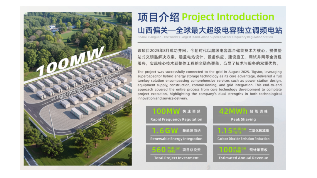 在电力领域,今朝时代成功并网全球最大百兆瓦级超级电容独立调频电站,总规模达100MW。该项目每年可支持1.6GW可再生能源并网,减少二氧化碳排放115万吨。