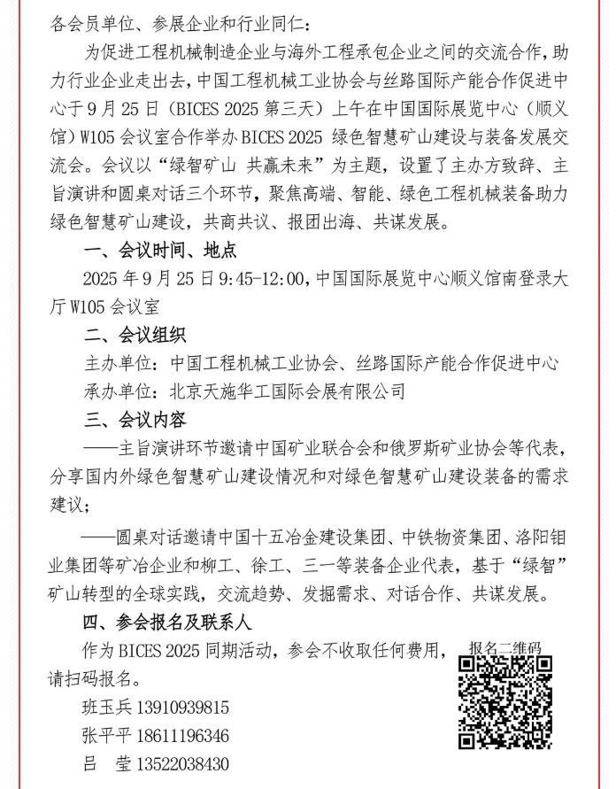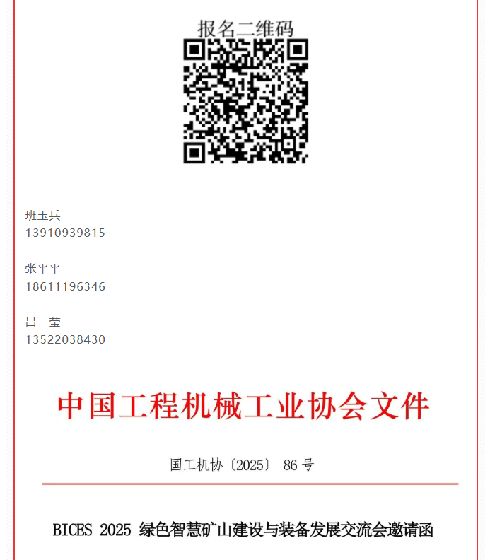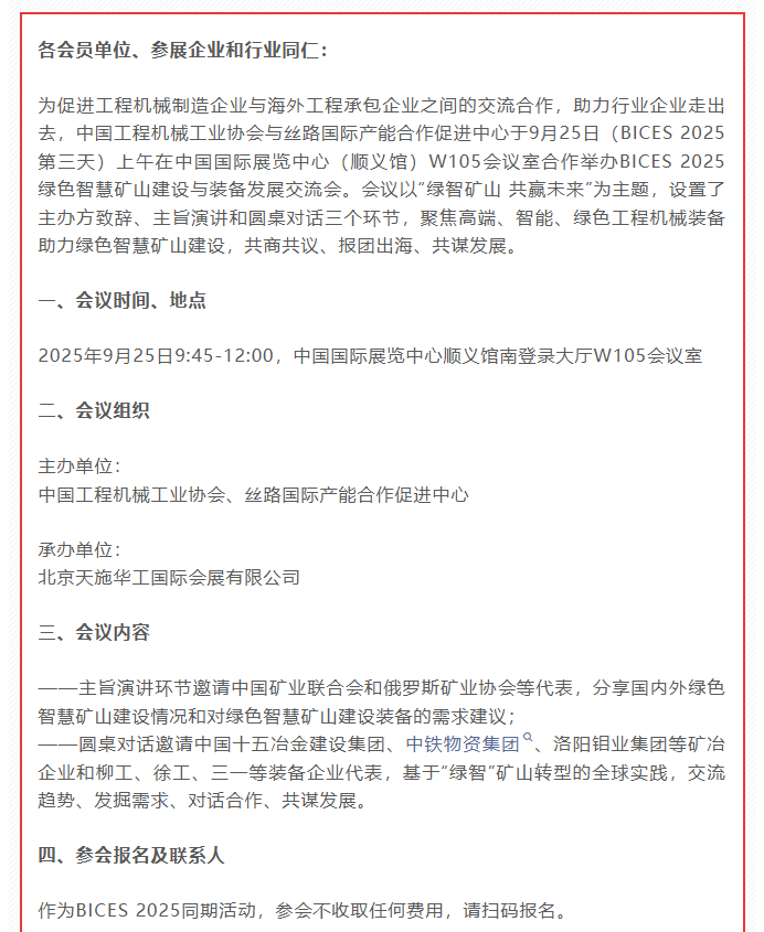 9月23—26日,中国(北京)国际工程机械、建材机械及矿山机械展览会(BICES 2025)将在中国国际展览中心(顺义馆)盛大举行。为促进工程机械制造企业与海外工程承包企业之间的交流合作,助力行业企业走出去,中国工程机械工业协会与丝路国际产能合作促进中心将于9月25日上午在中国国际展览中心(顺义馆)W105会议室合作举办“BICES 2025绿色智慧矿山建设与装备发展交流会”。